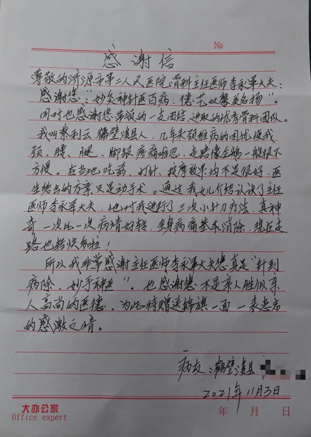 在整个治疗过程中,李医生认真负责的态度,高超的医术都让她叹服,直呼“神医”!为了表达深深的感激之情,特撰此信以表谢意。