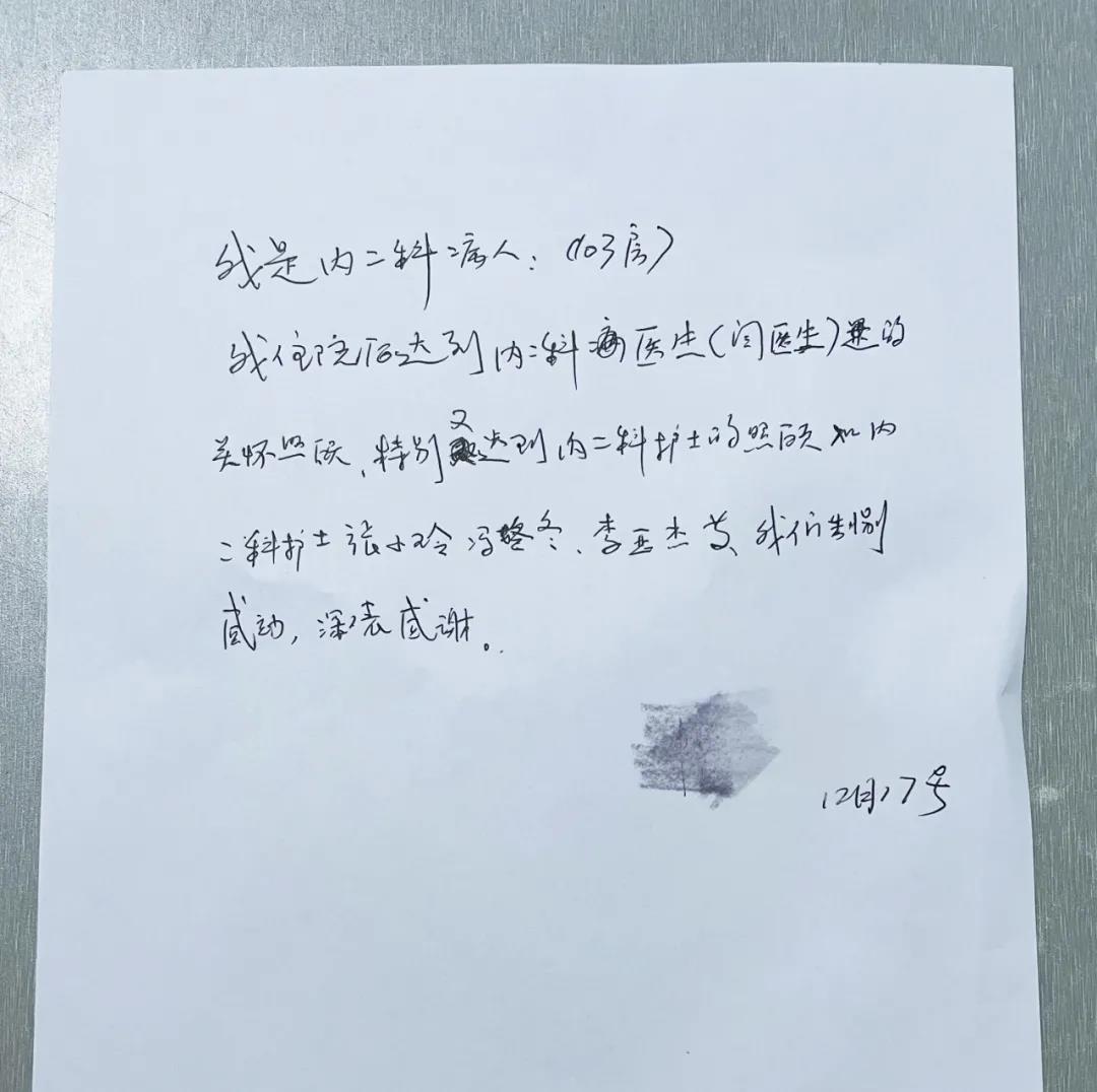 这天,护士长张晓玲在病房查房时又看到了这个熟悉的身影,“护士长,我给你们拿了几个苹果,表达一下我的心意,住院时候,咱们这医生护士对我实在是太好了……”早上患者比较多,护士长一边跟牛老先生说话一边去拿东西,谁知道牛老先生寸步不离地跟着护士长,边说边把袋子往护士长手里塞,手里扎扎实实的重量让护士长拒绝不了,就这牛老先生还不满意,非让护士长拿纸和笔要写几句话。许是年纪大了身体不舒服,牛老先生拿笔的手有点颤抖,短短几行字,承载了太多的情感在里面。