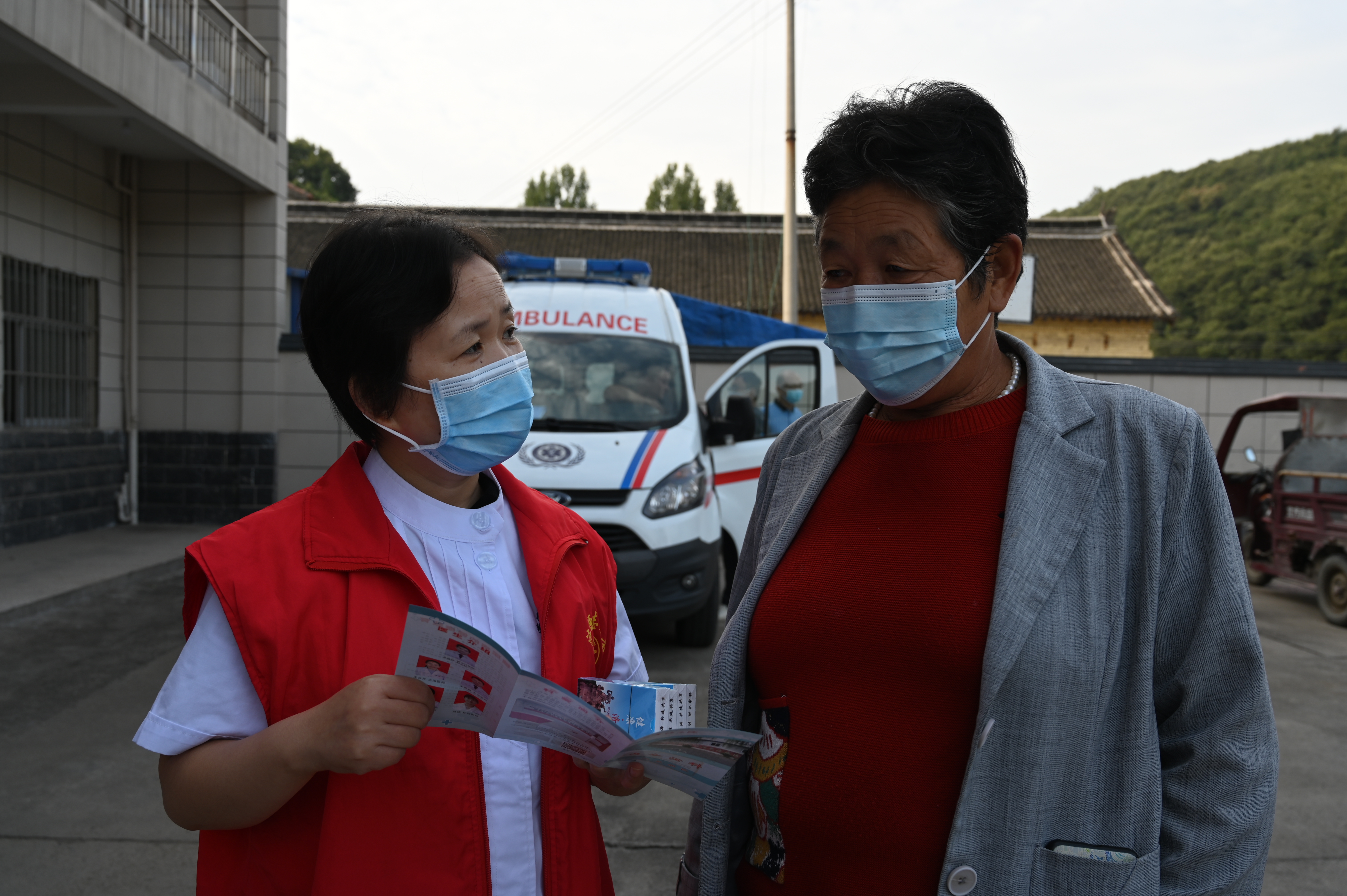 护士李芳通过发放健康教育宣传资料等方式向村民普及国家政策、医学常识和健康知识,引导群众养成健康生活习惯,科学就医。