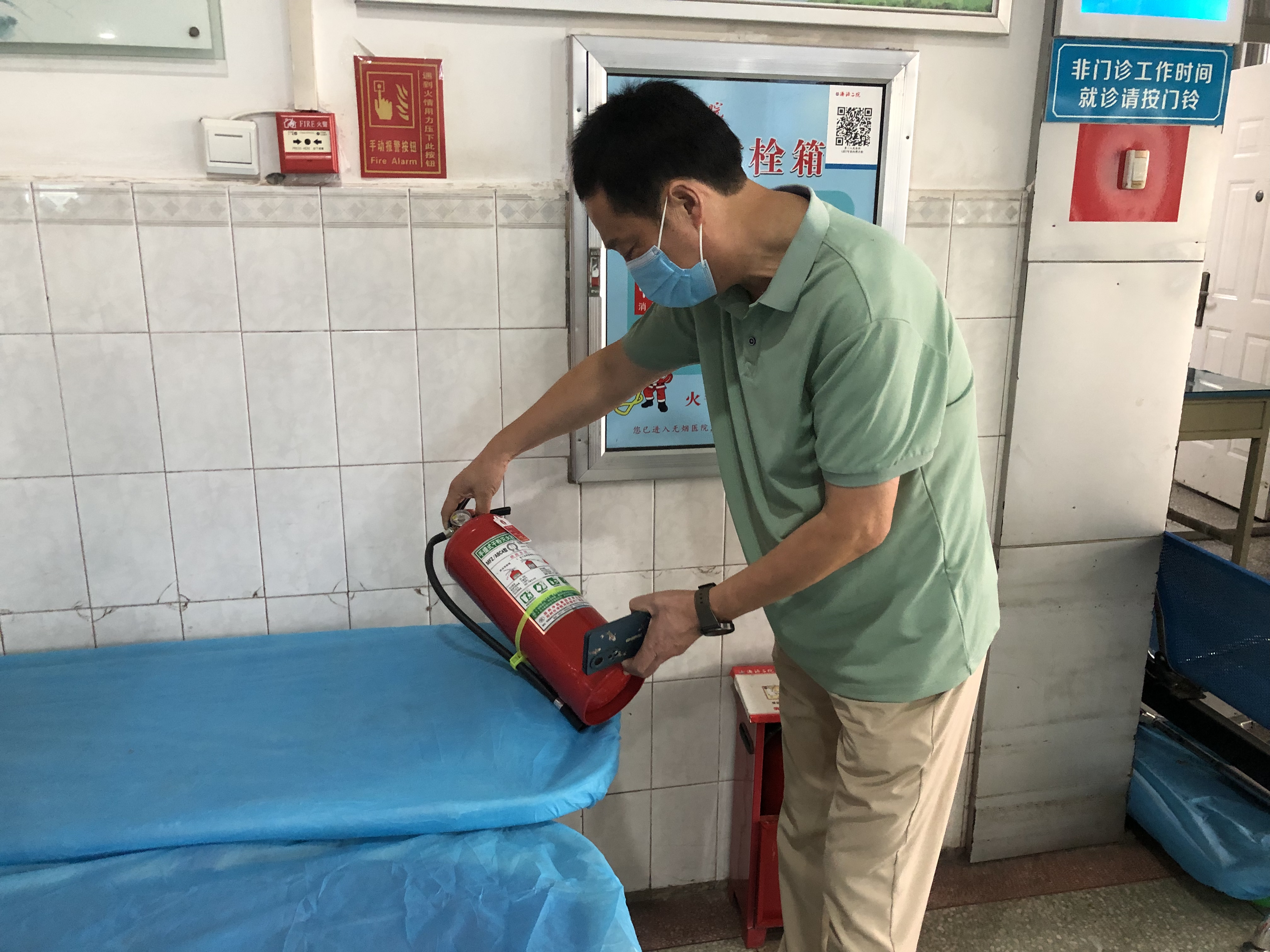 检查组一行,还对综合病房楼的各类消防安全设施进行了抽检,在住院药房详细查看了麻醉类和精神类注射药品及安瓿保管使用流程和登记本,在医院餐厅查看了食品留样专用冰箱、操作间抽油烟机以及燃气泄漏自动报警器等,对餐厅职工如何正确操作使用灭火器进行了现场抽查。