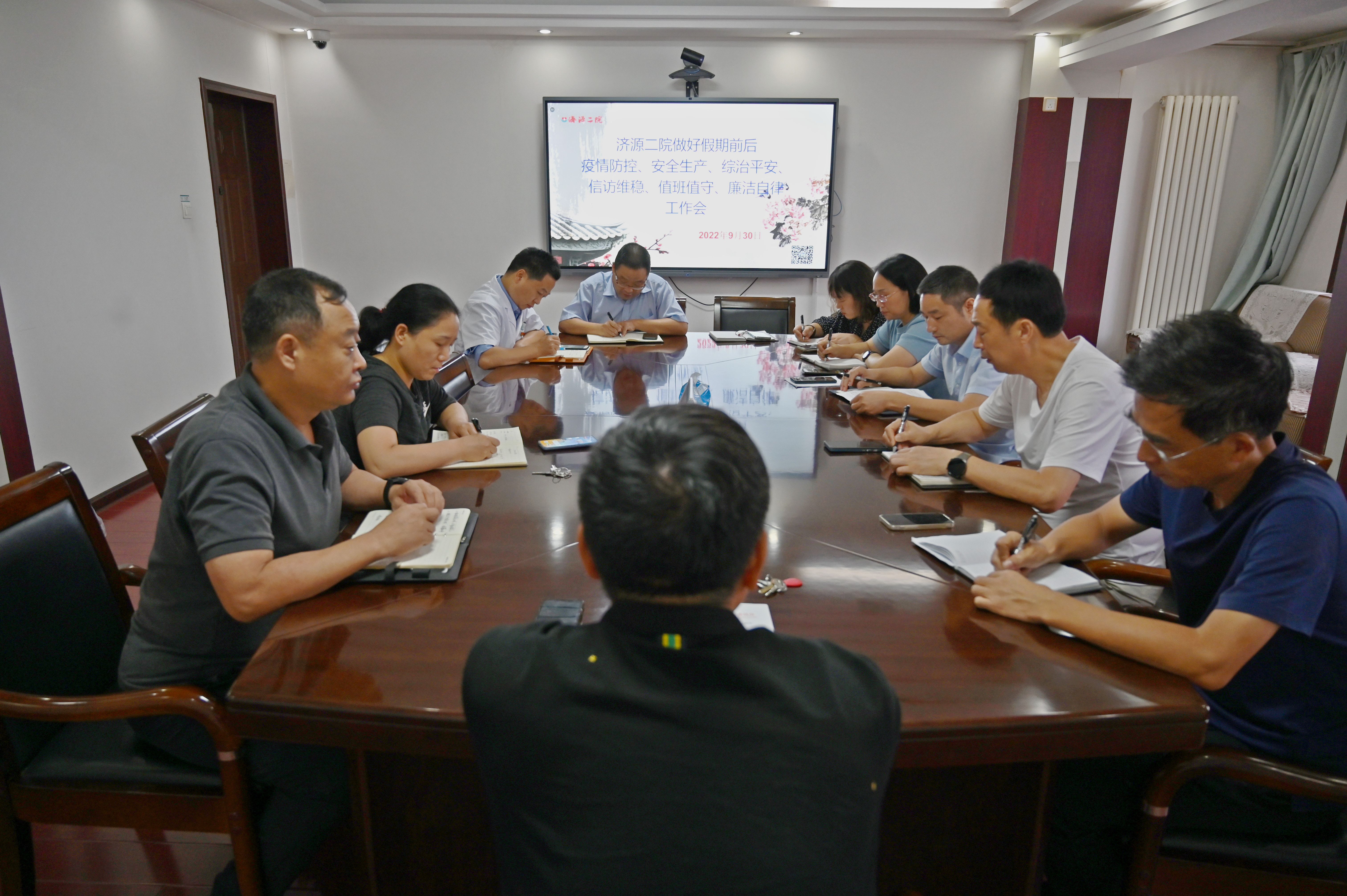 为确保国庆节假日期间及前后医院各项工作平稳运行,落实好常态化疫情防控措施,营造安全和谐稳定的医疗环境,以实际行动迎接党的二十大胜利召开,9月30日下午,我院召开“济源二院做好假期前后疫情防控、安全生产、综治平安、信访维稳、值班值守、廉洁自律工作会”,院班子成员及相关科室负责人参加会议。