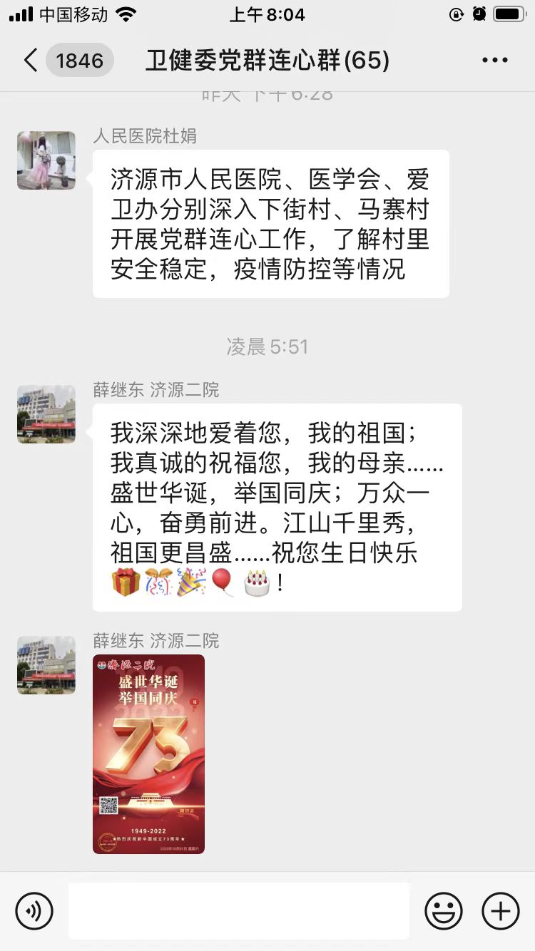 国庆日当天,在急诊科楼顶悬挂国旗,五星红旗迎风飘扬,干净整洁鲜艳夺目,激发了全体干部职工的爱国意识,党员的先进觉悟,共同庆祝伟大祖国的生日;利用微信群、公众号、大屏幕进行宣传,营造喜迎国庆的浓厚宣传氛围,激发群众爱国主义热情;牢固树立安全意识,加强对医院工作和就诊场所的安全管理,扎实做好新冠肺炎疫情防控工作,确保各项活动安全有序、欢乐祥和。假日期间,医院带班领导24小时,值班值守人员坚守岗位,严格督导,严格要求职工及家属离济返济依规报备,做到每两日做一次核酸检测,每天按照规定时间上报卫健委办公室;认真落实党群连心工程各项工作任务。国庆假日期间,市二院下沉党员假期无休,与北海街道三庄村两委党员干部坚守岗位,坚持开展疫情防控督导、安全生产检查和信访稳定等工作,进店入户宣传党和国家政策,教育引导群众严格落实外地返回人员提前报备和监测核酸、居家健康监测等措施,督导小超市、小店铺、小餐馆、早餐店认真落实场所码、戴口罩、常通风、勤洗手、一米线、不聚集等防控措施,确保国庆长假安全稳定,为迎接党的二十大胜利召开,营造了安全稳定的社会环境,用实际行动践行习近平总书记重要讲话精神,为提升新时代基层现代化治理能力发挥了积极作用。