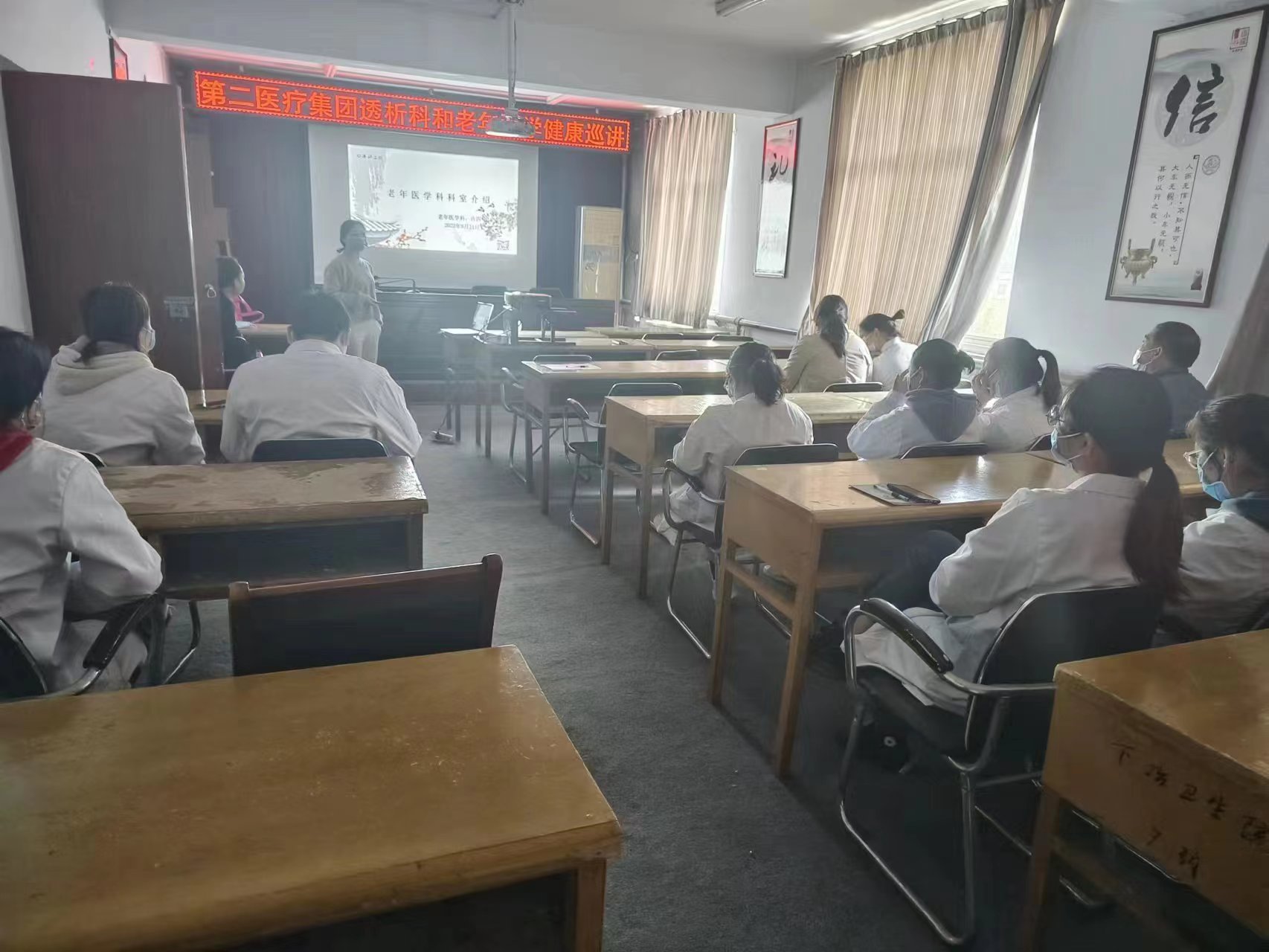 蒋万里主任详细的讲解了慢性肾衰竭的病因、诊断、并发症、治疗等相关知识,并现场播放了视频“芝麻芝麻开门吧”让大家以视频的方式去了解血液净化科,从中了解血液透析病人的管路维护及预防,许四化主任以PPT的形式讲解了老年人常见疾病的诊断、病因、并发症、预防及治疗的相关知识,并详细的给大家介绍老年医学科收治病人的范围,让大家更多的去了解老年医学科这样的新型科室,使老年人可以有病医病,无病疗养,有效的提高老年患者生活自理能力和生存质量,消除患病老年人及其家属的后顾之忧,从而真正实现“老有所养、老有所医、老有所靠”让老年人可以在这里安享晚年。