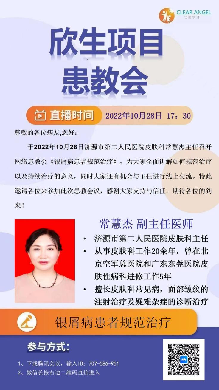 同时,2022年10月28日,皮肤科常慧杰主任召开网络患教会《银屑病患者规范治疗》,旨在帮助银屑病患者了解目前银屑病治疗手段及持续治疗的意义。