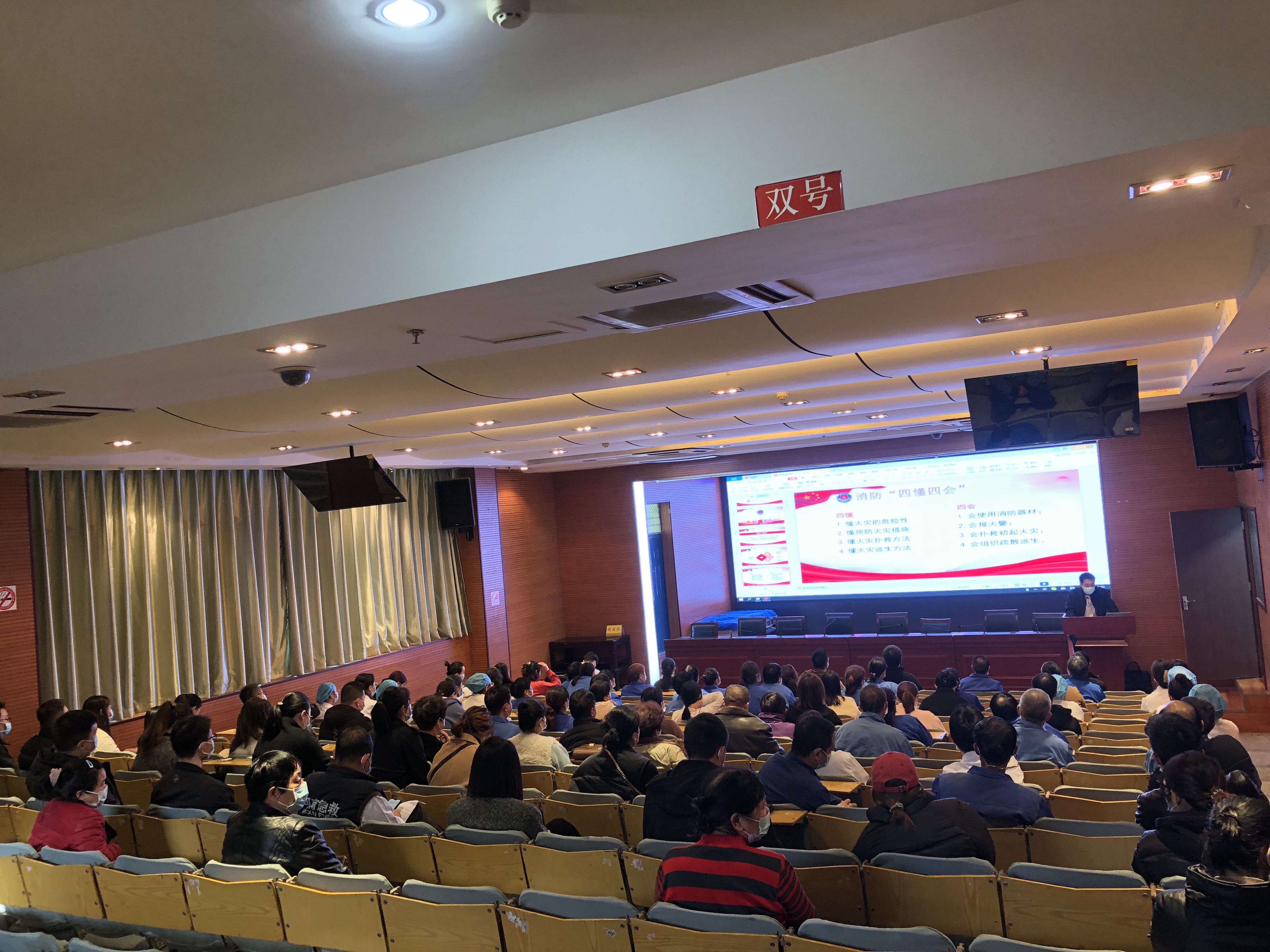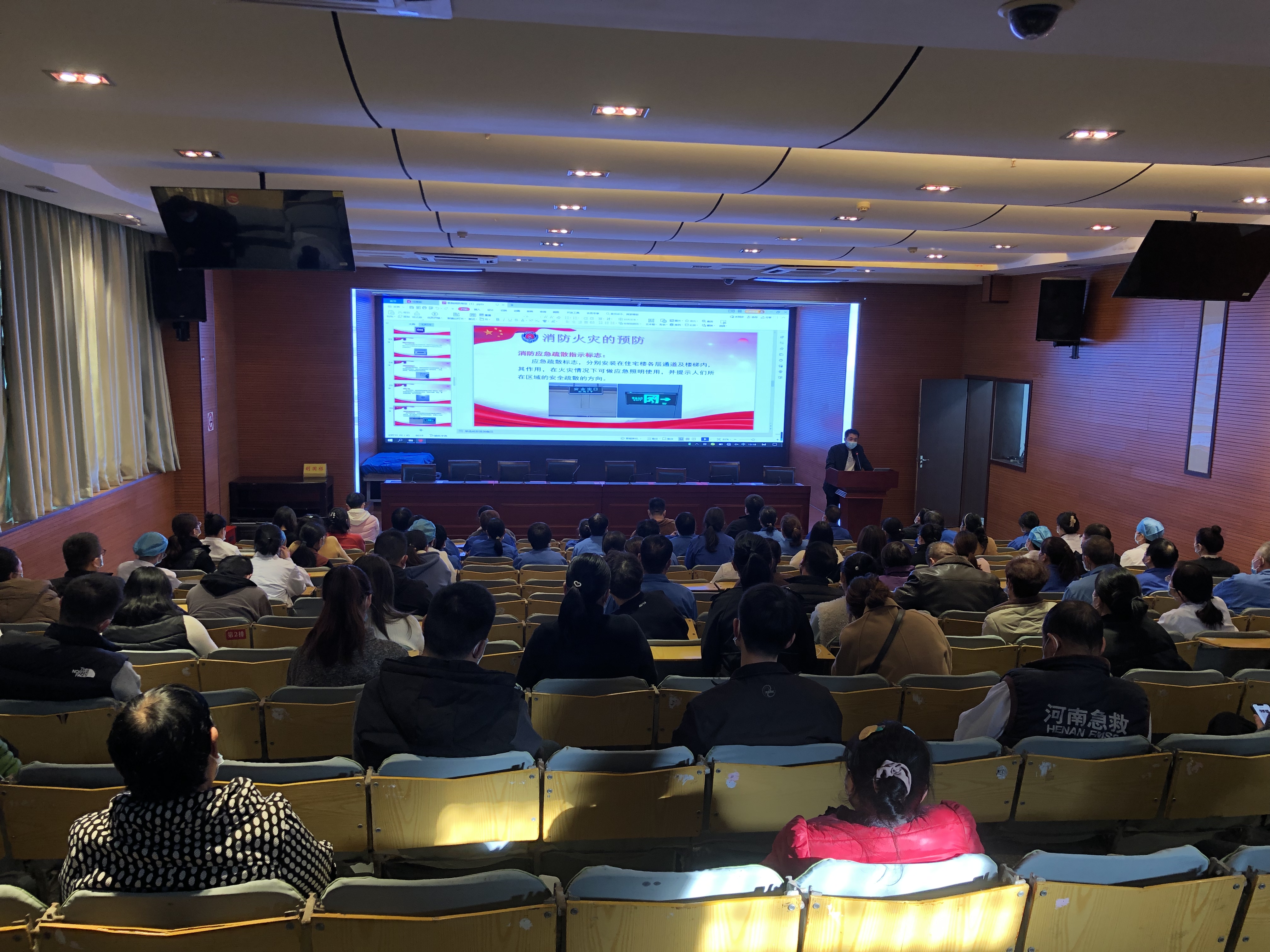 为深刻吸取安阳“11.21”火灾事故教训,全面普及消防安全知识,提高职工安全防火观念和自救互救能力,2022年11月24日,院在多媒体会议室组织职工开展“119”消防宣传月专题培训活动同时组织观看了警示教育片,现场讲解灭火器正确操作使用方法和注意事项,医院职工、保洁人员、保安人员以及餐厅工作人员等100多人参加了培训。院消防控制室张亚利、葛伟主持培训。