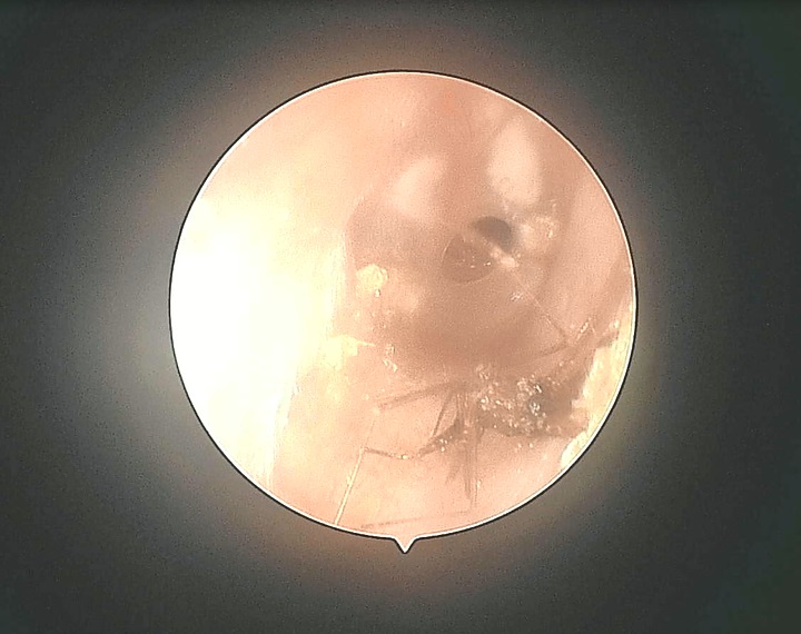 五官科主任许金中了解原因后,立即为其检查,内窥镜下,惊人一幕发生了:可以清晰的看到有一只蛐蛐,在顾先生的耳道里面蠕动。因为蛐蛐是头朝里面,钻进了狭窄的耳道,依靠外部刺激,根本不会“调头”出来,只能一直往里钻。想来这就是折磨顾先生耳朵的“罪魁祸首”。考虑到昆虫是活体时进入耳道内的,有倒钩的腿部或者口器可能已经对耳道造成了损伤。许主任决定尝试取异物,防止虫子进入耳道深处。