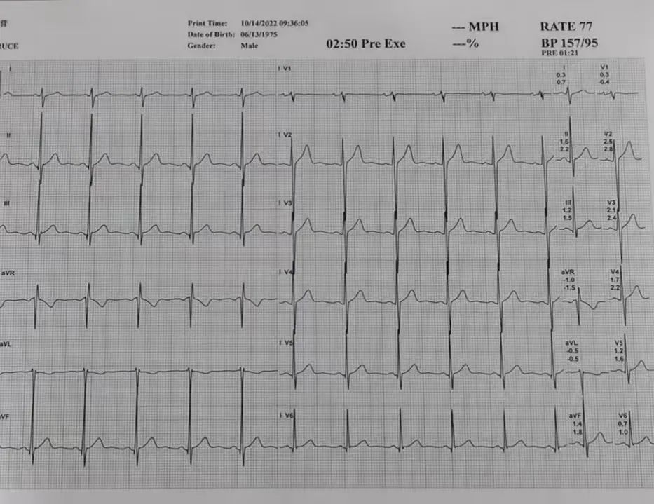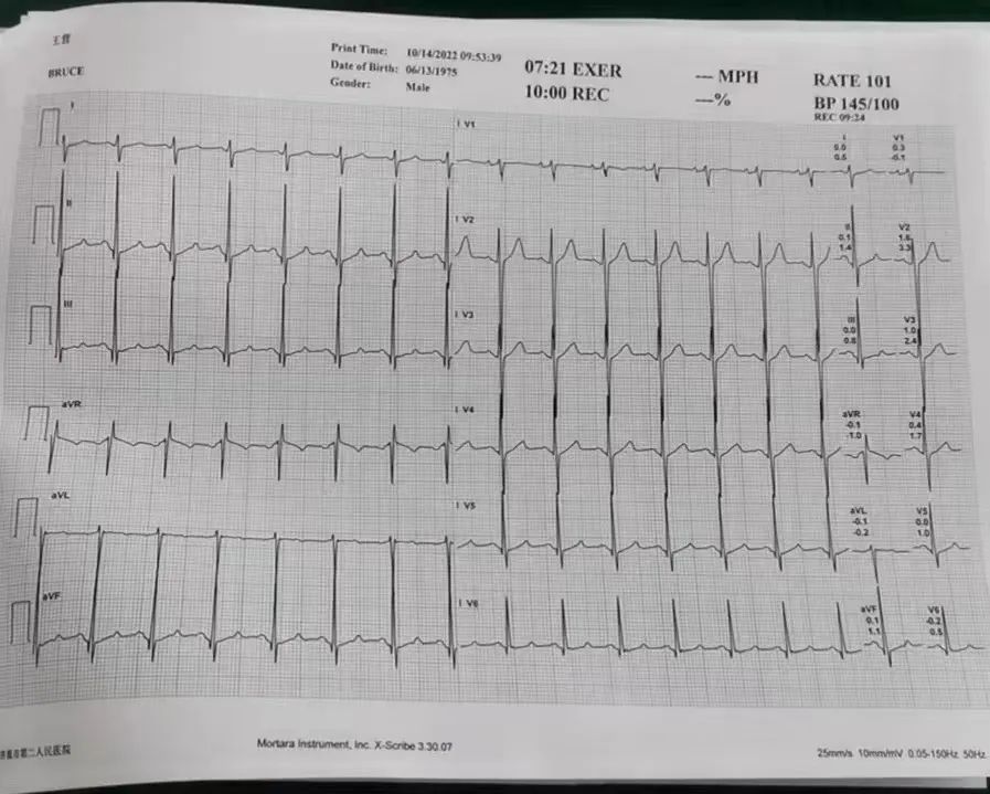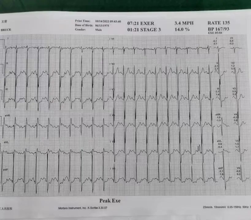王某,男,今年47岁,以“活动后牙痛半年”为主诉入院,主管医生马玉侠开运动平板试验来到我科。给患者处理皮肤,上跑步机前听王大哥说,身边一个熟人39岁,前一天还好好的,第二天因心脏病发作突然就没了,言语间可以感受到他的恐惧情绪。熟人的事对他造成了很深的心理阴影,同时也给他敲了一个警钟,他觉得自己的症状不像单纯的牙齿发炎,遂立即来到我院就诊。从他的症状描述我觉得心绞痛的概率很大,所以上跑步机后就高度警惕。