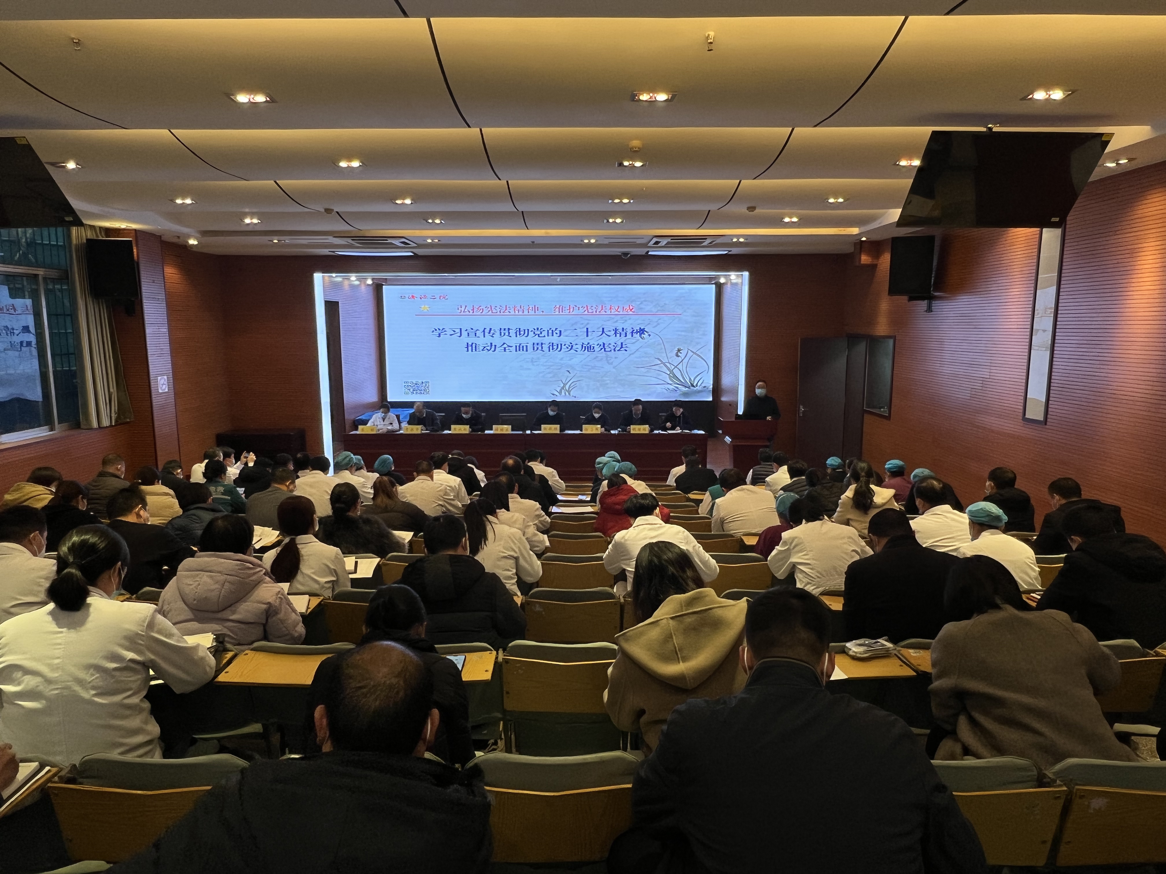 12月4日是我国第九个国家宪法日,也迎来了第五个“宪法宣传周”。为深入学习宣传贯彻党的二十大精神,弘扬宪法精神、维护宪法权威,2022年12月6日,我院在多媒体教室举办“宪法宣传周”法治教育专题培训活动,院班子成员、中层干部党员90人参加会培训。党总支纪检委员胡国栋主持。