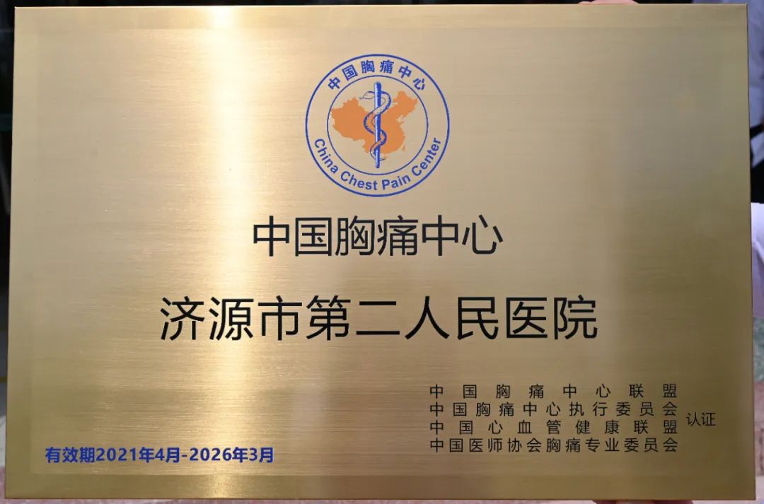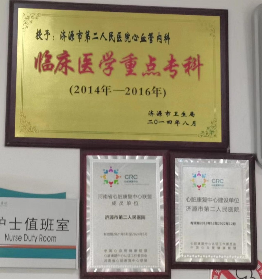 为更好突出心血管专科建设,更好服务济源人民,经全体医护人员努力,2014年内一科成为济源市重点心血管专科,2016年成为全国胸痛中心的一员,而且是济源市第一家胸痛中心,2021年顺利通过胸痛中心再次认证。2022年通过房颤中心认证。2016年成立心血管重症救治单元(CCU)。胸痛、房颤中心的认证,使济源人民的相关心血管疾病救治更加规范、合理,后续我们还要通过心衰、高血压救治中心的认证。