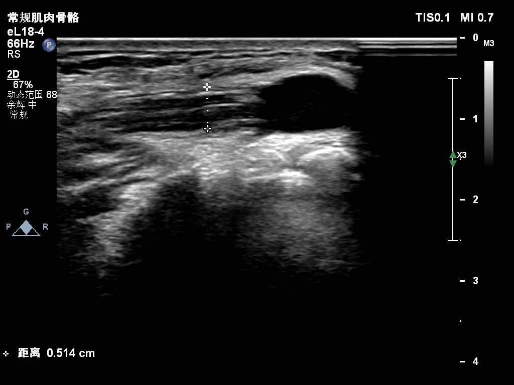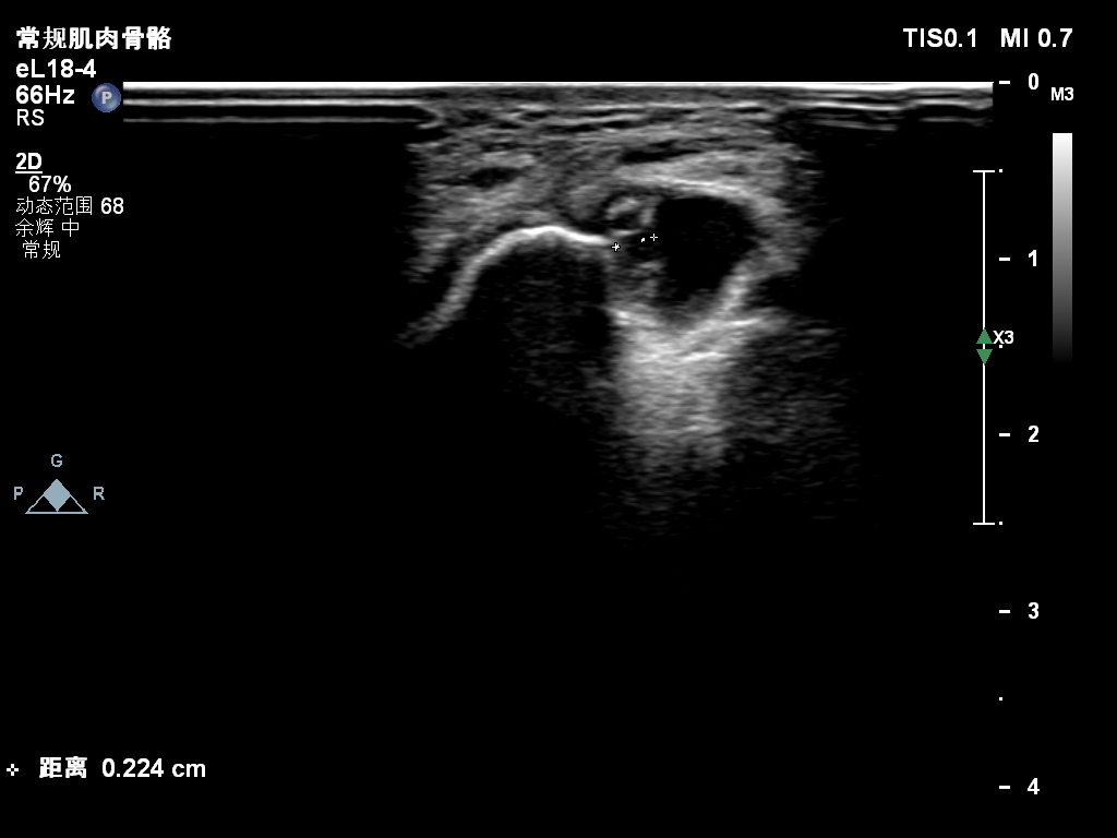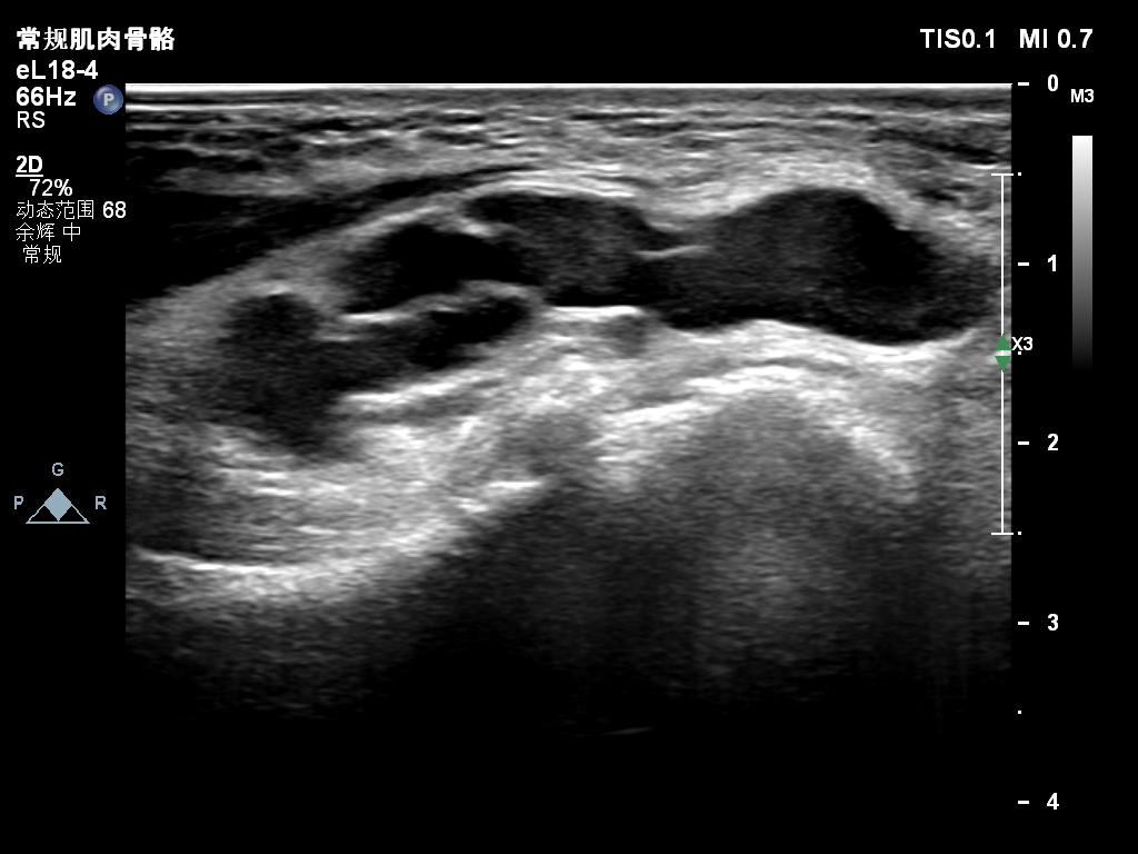 超声所见:右侧尺神经于肘管上段增粗,较粗处横截面积约0.25cm²,神经外膜及神经束膜显示欠清晰,神经纤维连续性可。尺神经走行至肘管处受压变扁,局部尺神经外膜处可见囊性结构并向肘管远段延伸,边界清,形态不规则,内可见多条带状分隔。CDFI:囊性结构内未见明显血流信号。