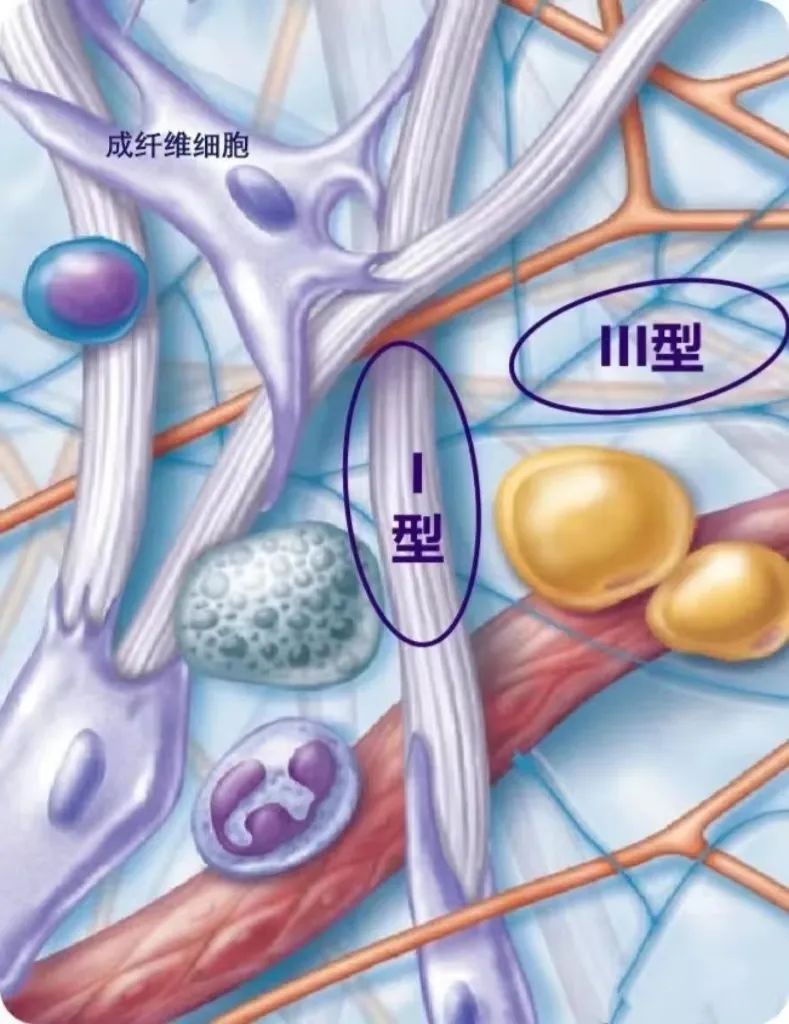 I型胶原蛋白占皮肤的80-85%,可以通过自身刺激生成。主要分布于皮肤真皮深层,纤维粗大,呈条束状,排列纵横交错,决定了皮肤坚韧度,但缺乏弹性。