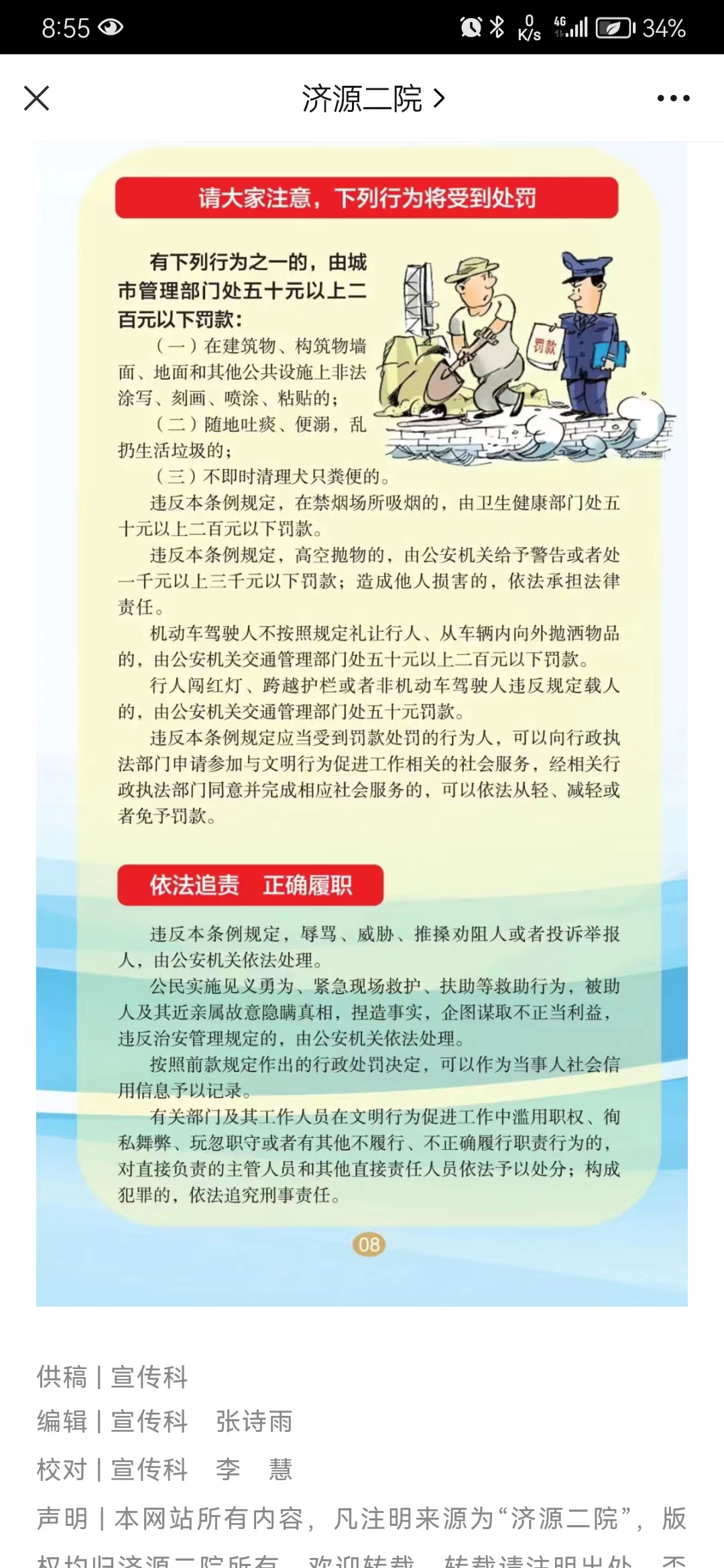 为深入贯彻学习《河南省文明行为促进条例》,践行和培育社会主义核心价值观,引导广大群众树立文明理念,促进文明行为养成,提升社会文明程度,进一步发挥文明单位的示范引领作用。按照示范区党工委文明办相关工作安排,3月2日,济源市第二人民医院组织开展《条例》学习宣传活动。