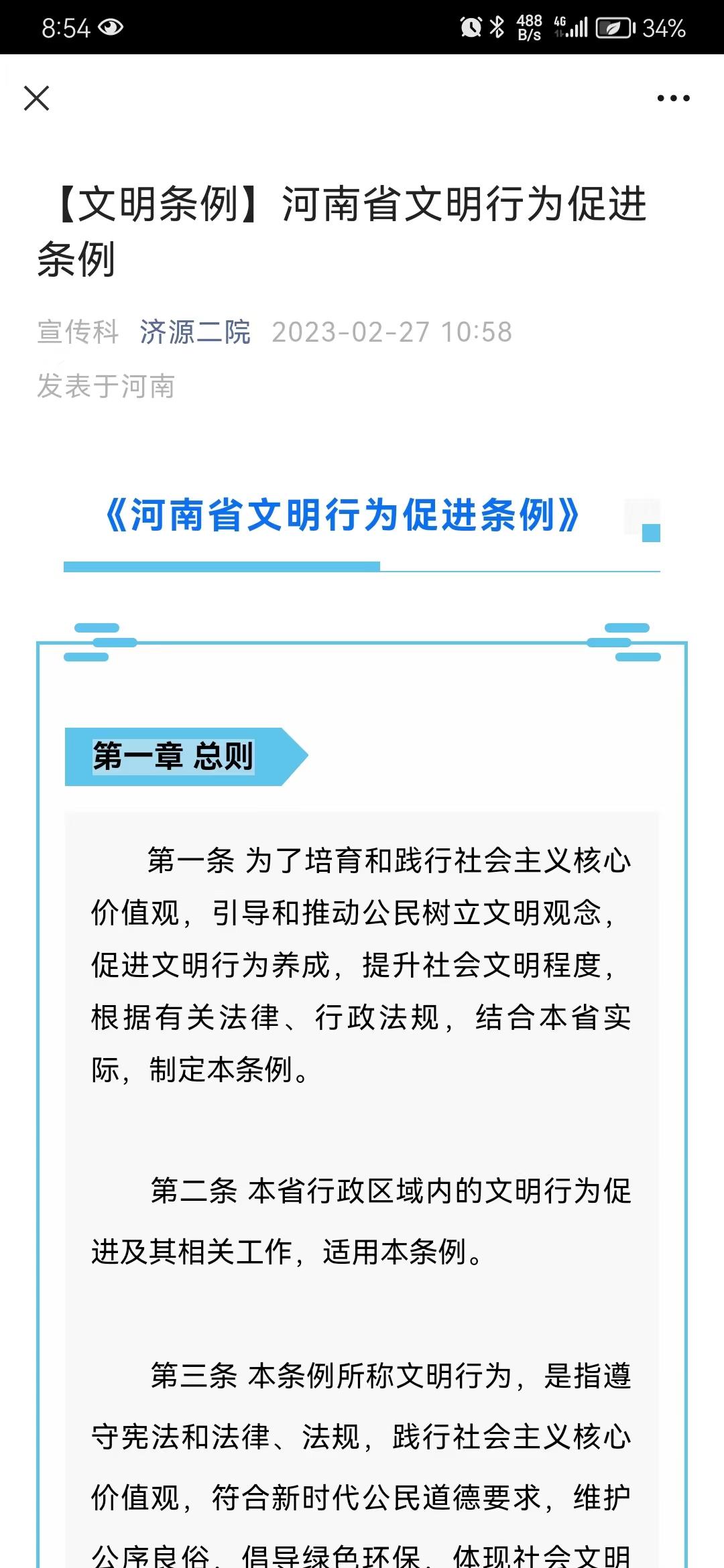 《河南省文明行为促进条例》已于2021年1月1日正式实施,标志着我省文明行为促进工作进入了法治化、规范化的新阶段。一言一行树形象,一举一动见文明。通过开展《条例》学习宣传实践活动,提升了广大群众的文明素质,引导广大人民群众规范公共文明行为,自觉培养文明习惯,营造人人知文明、人人讲文明的浓厚社会氛围。