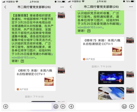 为了准时高效收看视频直播,我院党建办高度重视、精心部署,提前向全体党员干部发出了学习通知。2023年3月25日晚间8点档在中央电视台综合频道(CCTV-1)首播,适时在中央电视台新闻频道(CCTV-13)等重播,在共产党员网(www.12371.cn)、共产党员微信、全国党员干部现代远程教育专用频道集中展播,《榜样》7本期节目邀请王亚平、王传喜、艾爱国、张玉滚、武大靖、林占熺、孟昆玉、路生梅等8位党的二十大代表参加录制,通过典型事迹展示、现场访谈、重温入党誓词等形式,生动展现中国共产党人坚定信念、践行宗旨、拼搏奉献、廉洁奉公的高尚品质和精神风范,彰显基层党组织战斗堡垒作用和党员先锋模范作用。