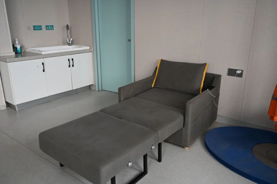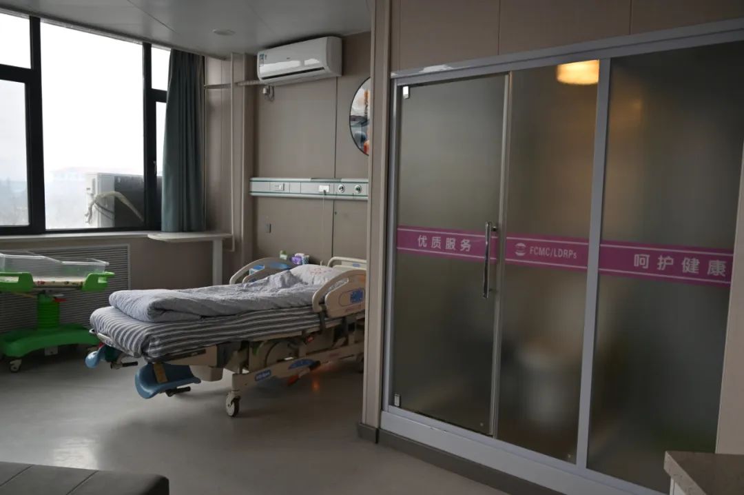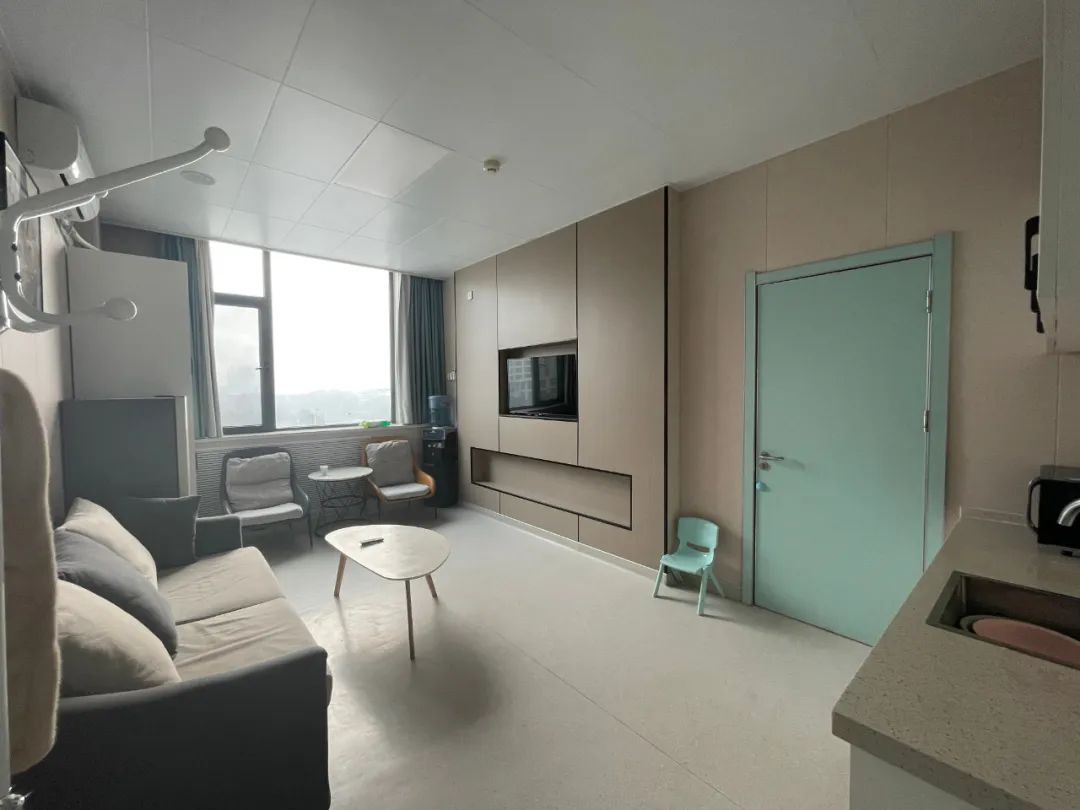 家庭式一体化产房配有独立的卫生间、沙发、衣柜、储藏柜、微波炉、电视等家具,让产妇在“待产”到“生产”到“恢复”都能有亲人陪伴,在医院也能享受到“在家”的温馨。