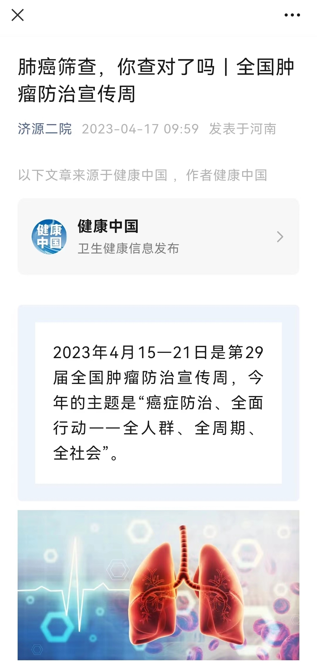 世界卫生组织提出:三分之一的癌症可以预防;三分之一的癌症可以通过早期发现得到根治;三分之一的癌症可以运用现有的医疗措施延长生命、减轻痛苦、改善生活质量。为了扩大宣传,提高群众的健康意识和开展防癌体检的主动性,我院在微信公众号转发“肺癌筛查,你查对了吗|全国肿瘤防治宣传周”这一文章,并积极号召职工学习转发,助力全社会防癌抗癌。