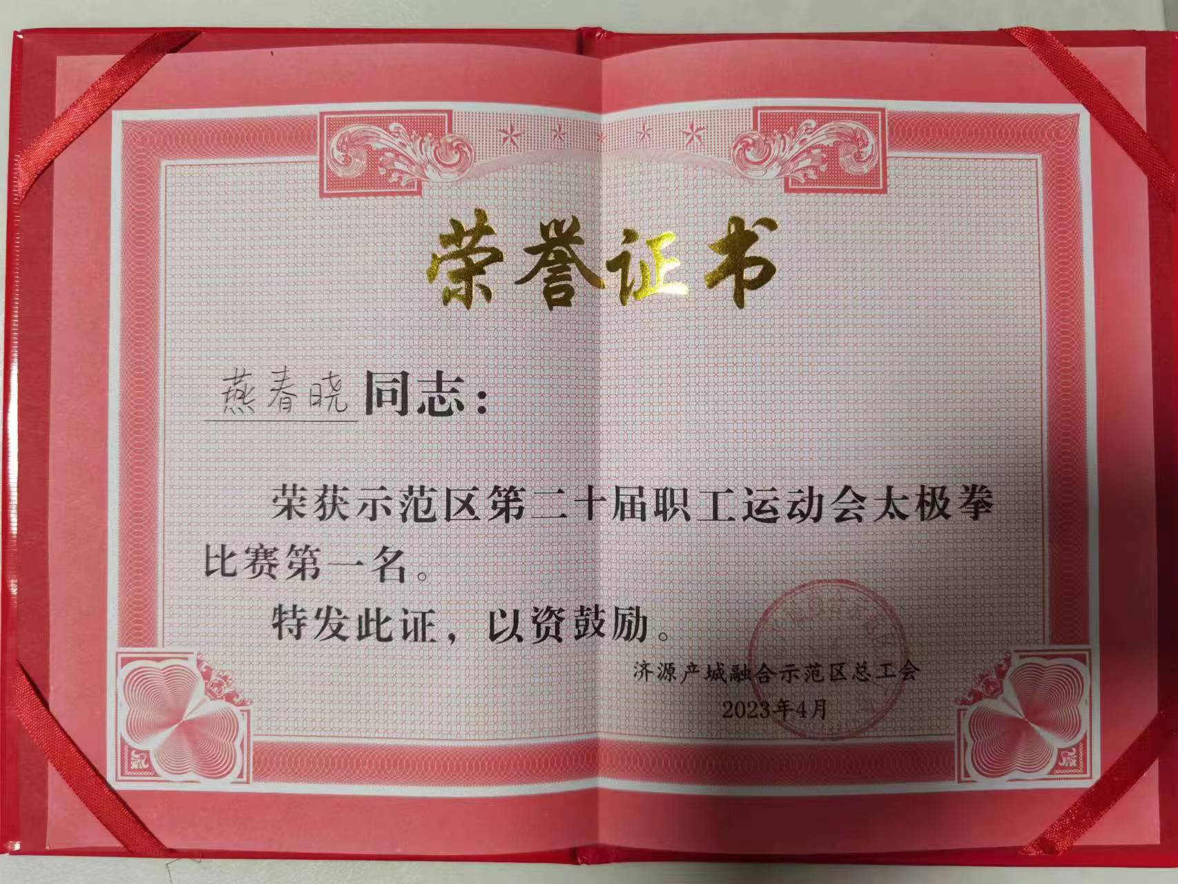 以“李前前、翟大保、李广杰、尚锦梁、赵亚楼、赵小涛、李松松、董明明、王薇、靳昕昕、卫峥、尚妍芳、刘艳丽、牛艳香、姚慧林”15人组成的队伍获得拔河比赛二等奖;燕春晓获得太极拳比赛第一名、女子跳绳比赛二等奖;胡飞霞获得羽毛球女子单打比赛三等奖。
