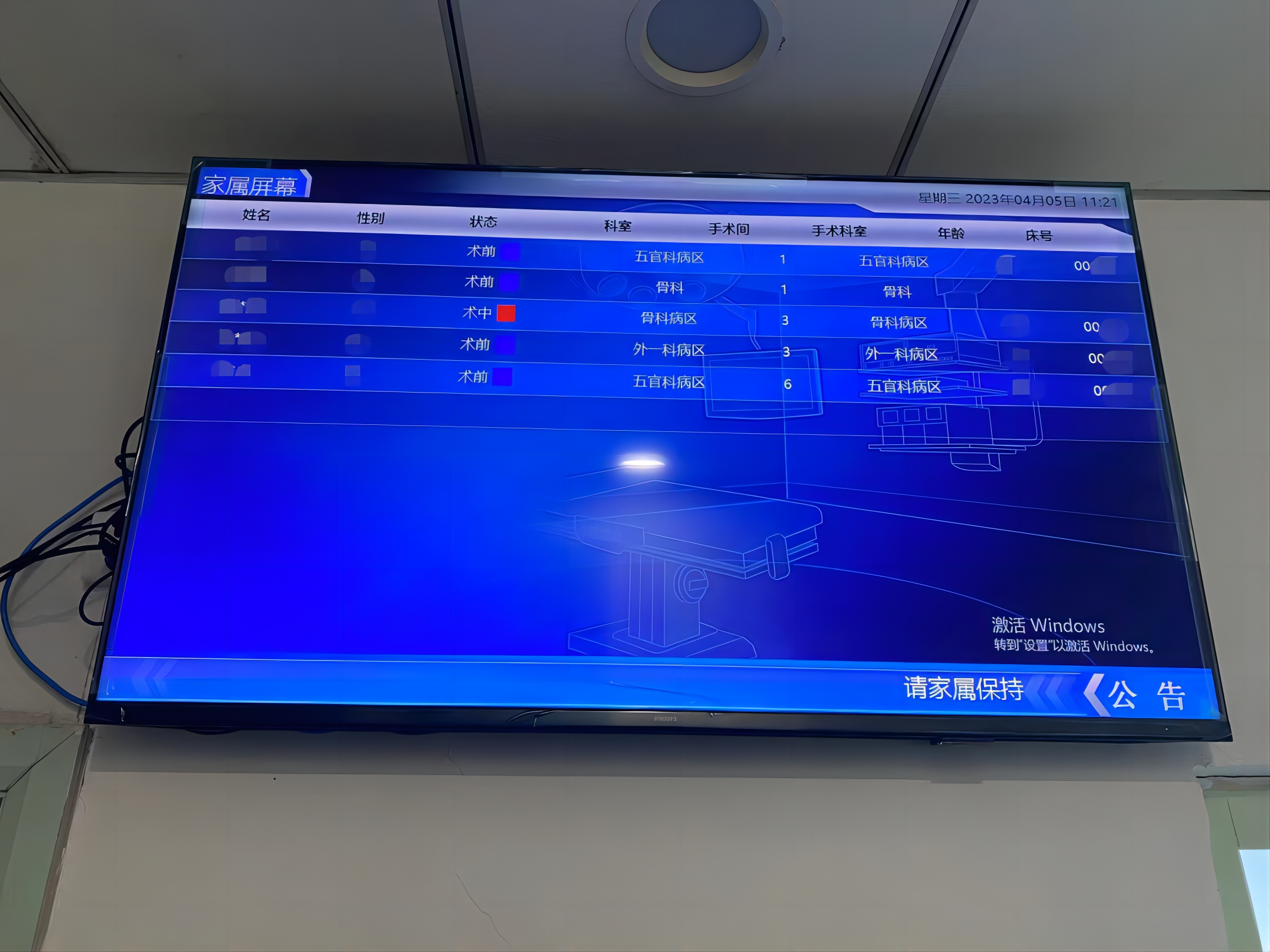 第五,为体现医院的人性化管理,在手术室外的家属等候区域设立电子显示屏,作为科室与家属沟通的渠道。在患者进入手术室后,手术进程可通过电脑屏幕实时同步告示,方便患者家属时刻关注了解手术进程,让患者家属安心、放心的等候。