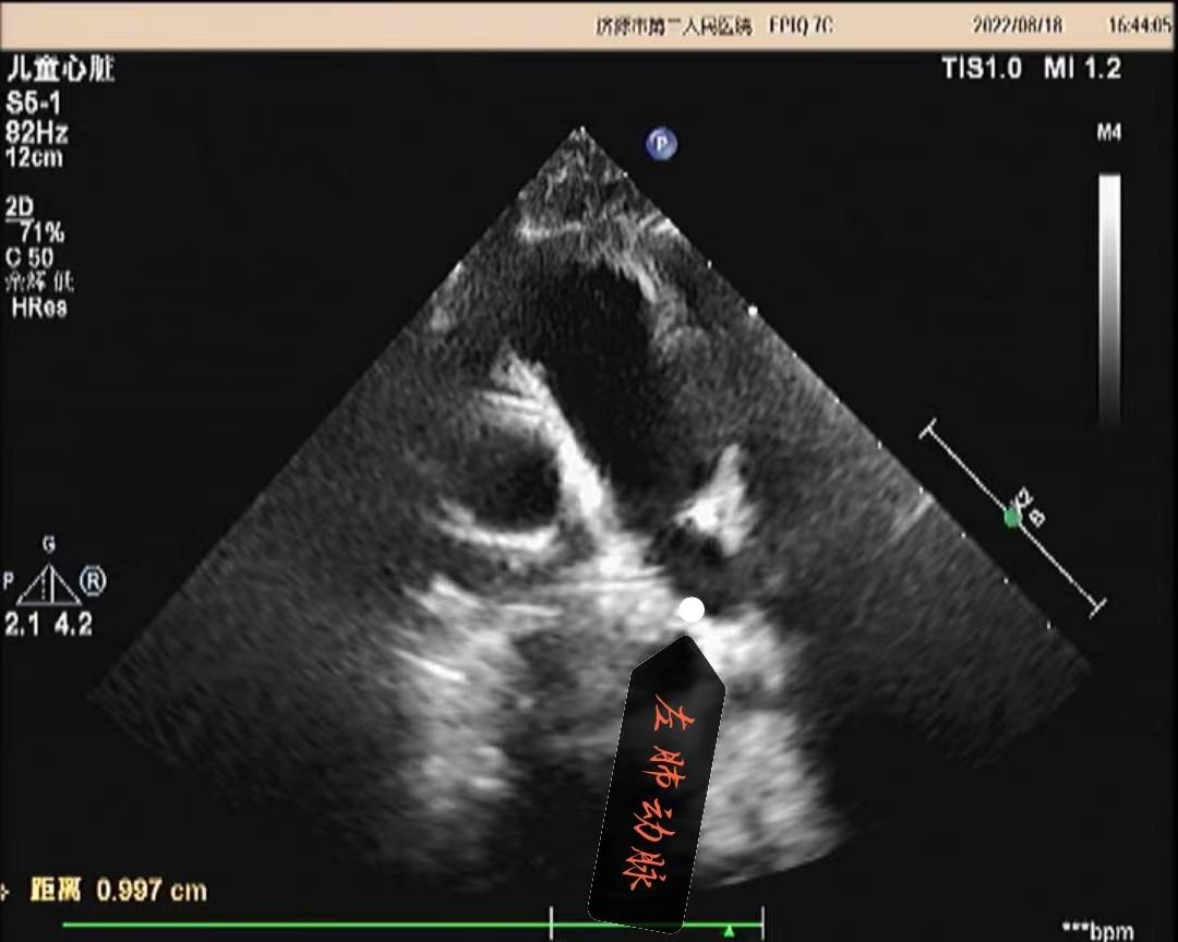 超声提示:1.左右肺动脉交叉 2.肺动脉主干内径增宽 3.肺动脉主干及左、右肺动脉前向流速增快 4.肺动脉瓣少量返流