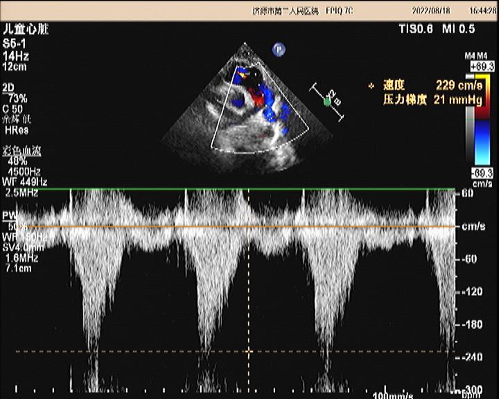 超声所见:各房室大小正常,肺动脉主干内径增宽,约20mm,左、右肺动脉内径分别约10mm、8.7mm,左、右肺动脉未见有狭窄,左肺动脉起始于主肺动脉的右侧并向左侧走行,右肺动脉起始于主肺动脉左侧向右走行。主动脉内径正常,搏动好。各瓣膜回声正常,肺动脉瓣开启可,关闭欠佳,余瓣膜启闭自如。房室间隔连续完整,室壁厚度及运动收缩幅度正常。CDFI:主肺动脉及左、右肺动脉前向流速增快。主肺动脉峰值流速:2.5m/s。左肺动脉峰值流速:2.2m/s。右肺动脉峰值流速:1.7m/s。肺动脉瓣口探及舒张期少量返流。