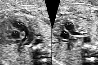 超声提示:胎儿左右肺动脉交叉