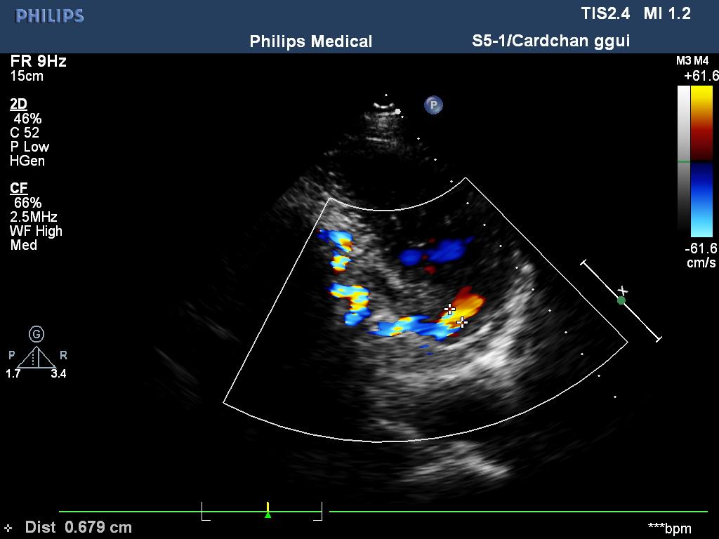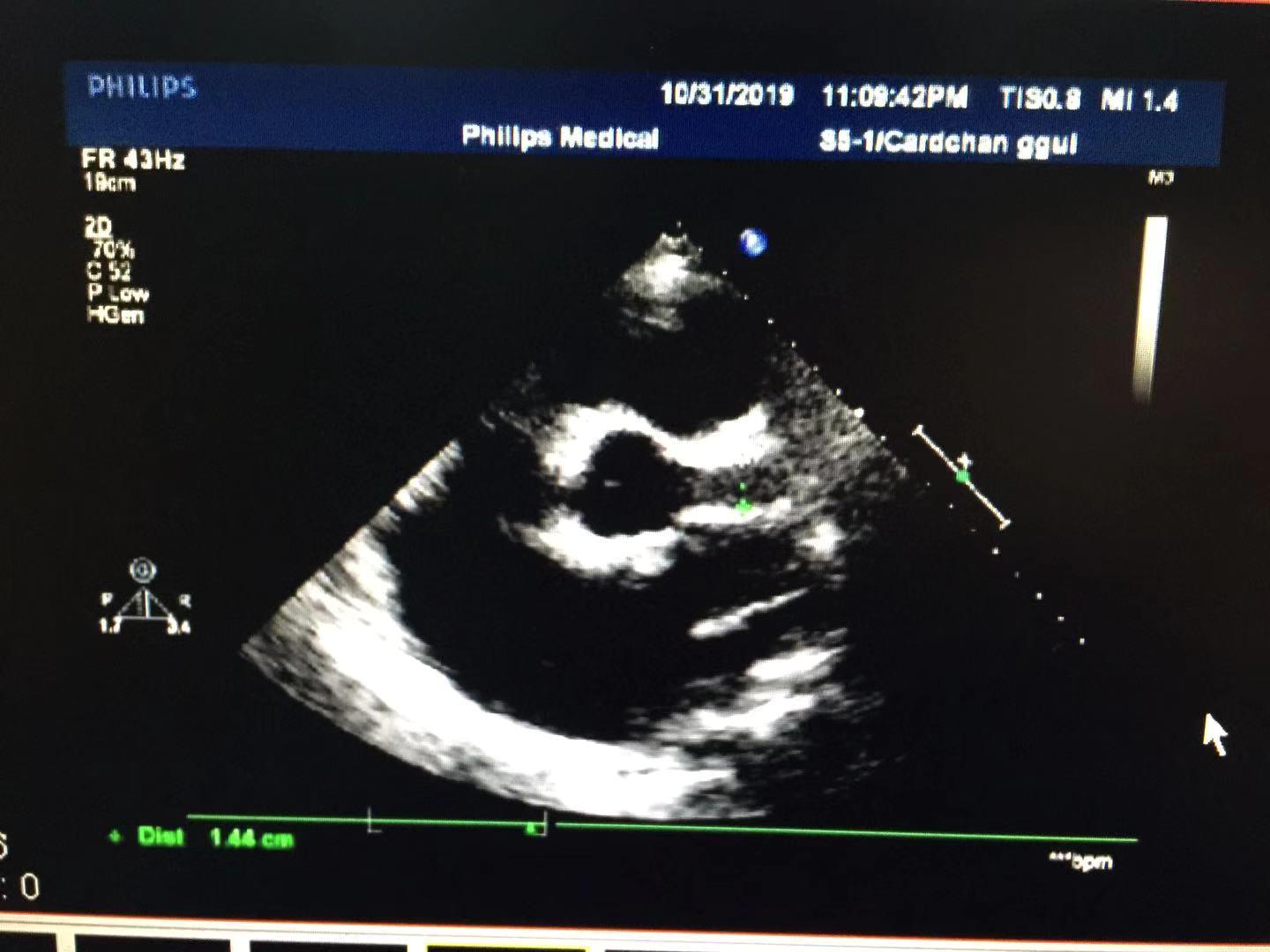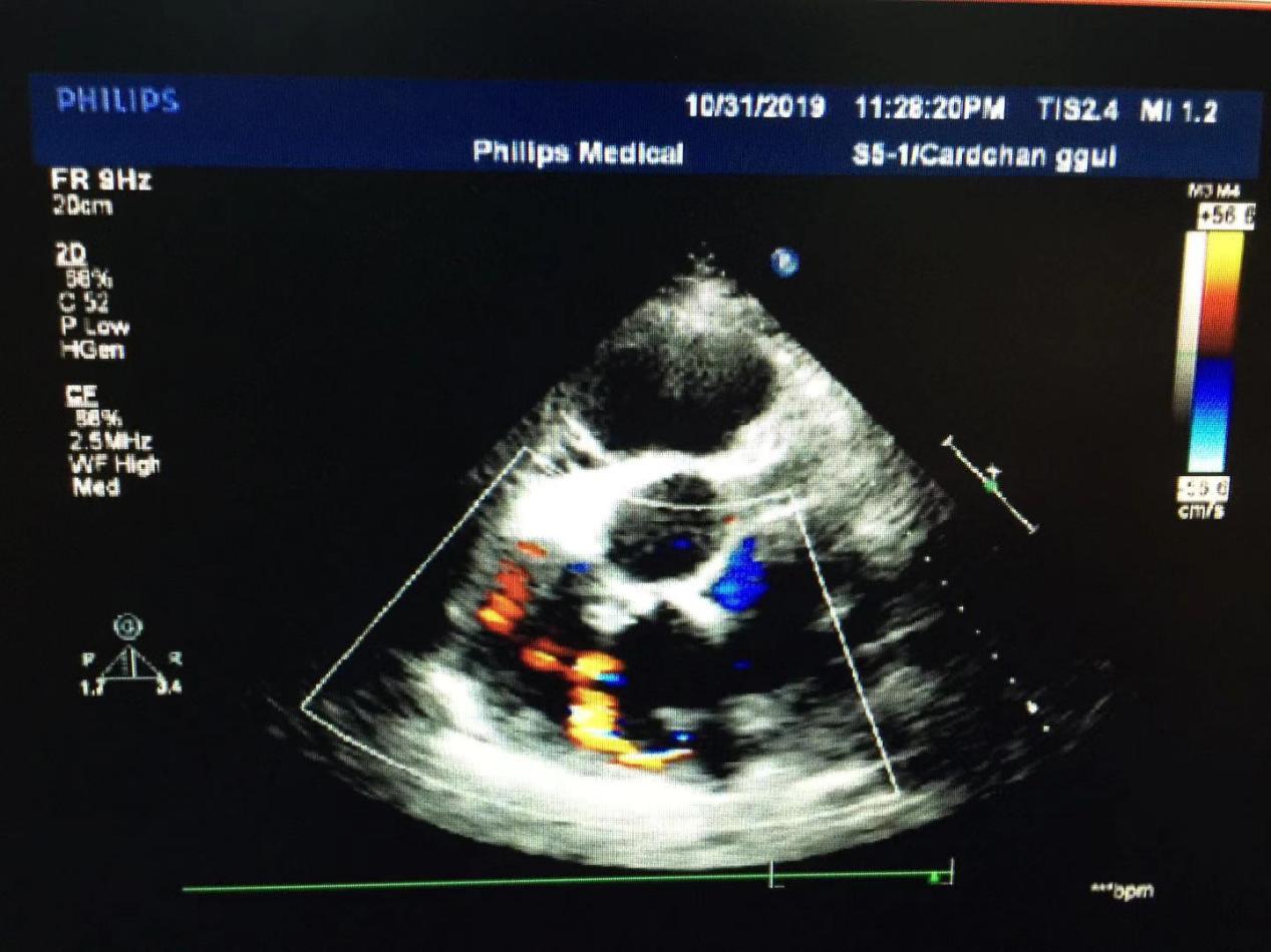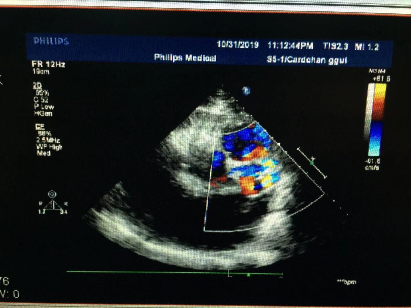 超声提示:1.左冠状动脉右房瘘;2.全心大;3.肺动脉高压(中度);4.二尖瓣中量返流;5.三尖瓣大量返流;6.左室收缩功能减低;7.心包积液(中量)。
