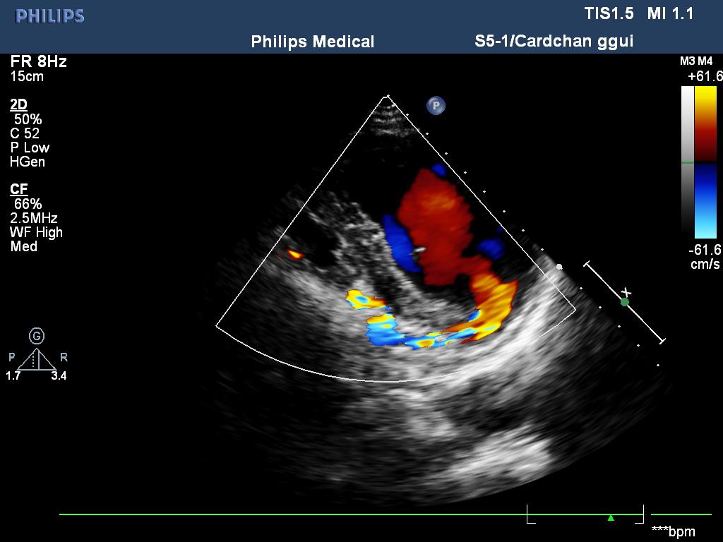 超声所见:全心大,肺动脉主干内径增宽。左冠状动脉迂曲增宽,可视长度明显增加,开口处内径约14mm,增宽的左冠状动脉沿左房越过房间隔开口于右心房,瘘口直径约8mm。房、室间隔连续完整,左室侧后壁运动减弱,余室壁运动尚可。各瓣膜形态正常,二尖瓣、三尖瓣、主动脉瓣开启可,关闭欠佳。心包腔内探及液性暗区,左室后壁深约17mm,右室之前深约13mm。CDFI:于右房内可见以舒张期异常血流信号。二尖瓣、三尖瓣口可见收缩期返流信号。主动脉瓣口可见舒张期返流信号。