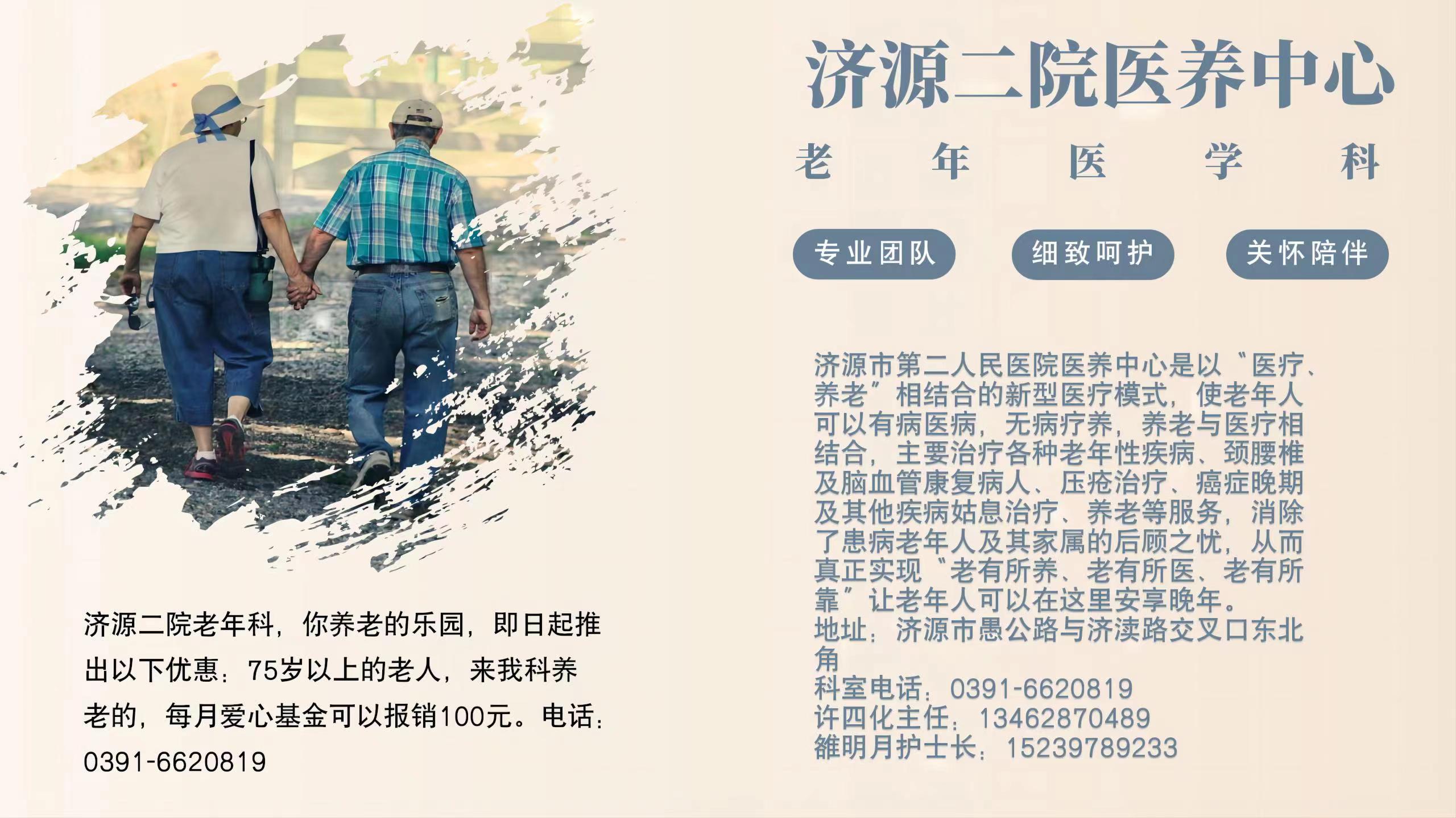 济源二院老年科,你养老的乐园,即日起推出以下优惠:75岁以上的老人,来我科养老的,每月爱心基金可以报销100元。电话:0391-6620819