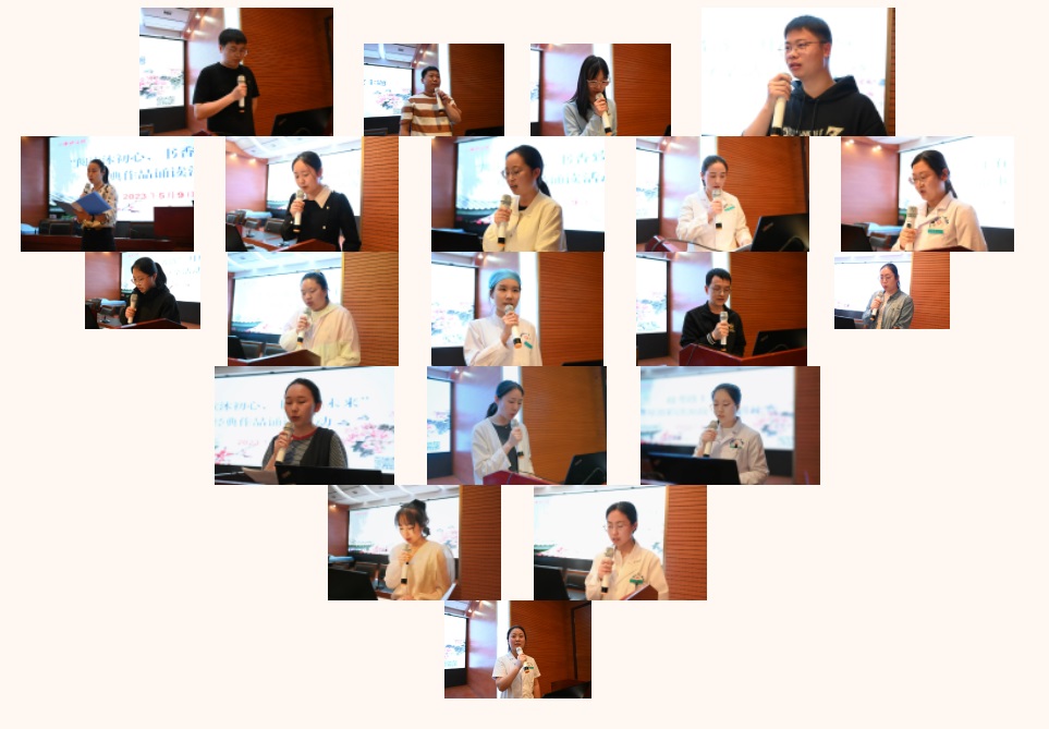 在“阅读沐初心,书香致未来”经典作品诵读活动上,大家分享了各自阅读的书目内容,并摘取精彩部分朗读,有的分享医学人文书籍《向世界最好的医院学管理》、《最年轻的科学》、《阿图医生》、《医学的人文呼唤》、《医学的温度》,有的分享经典名著《月亮与六便士》、《活着》、《人生》,有的分享《孔子传》、《时间简史》、《我与地坛》等优秀作品。他们慷慨激昂、精神饱满的诵读,自信大方的形象、出色的表现赢得了大家的阵阵掌声。