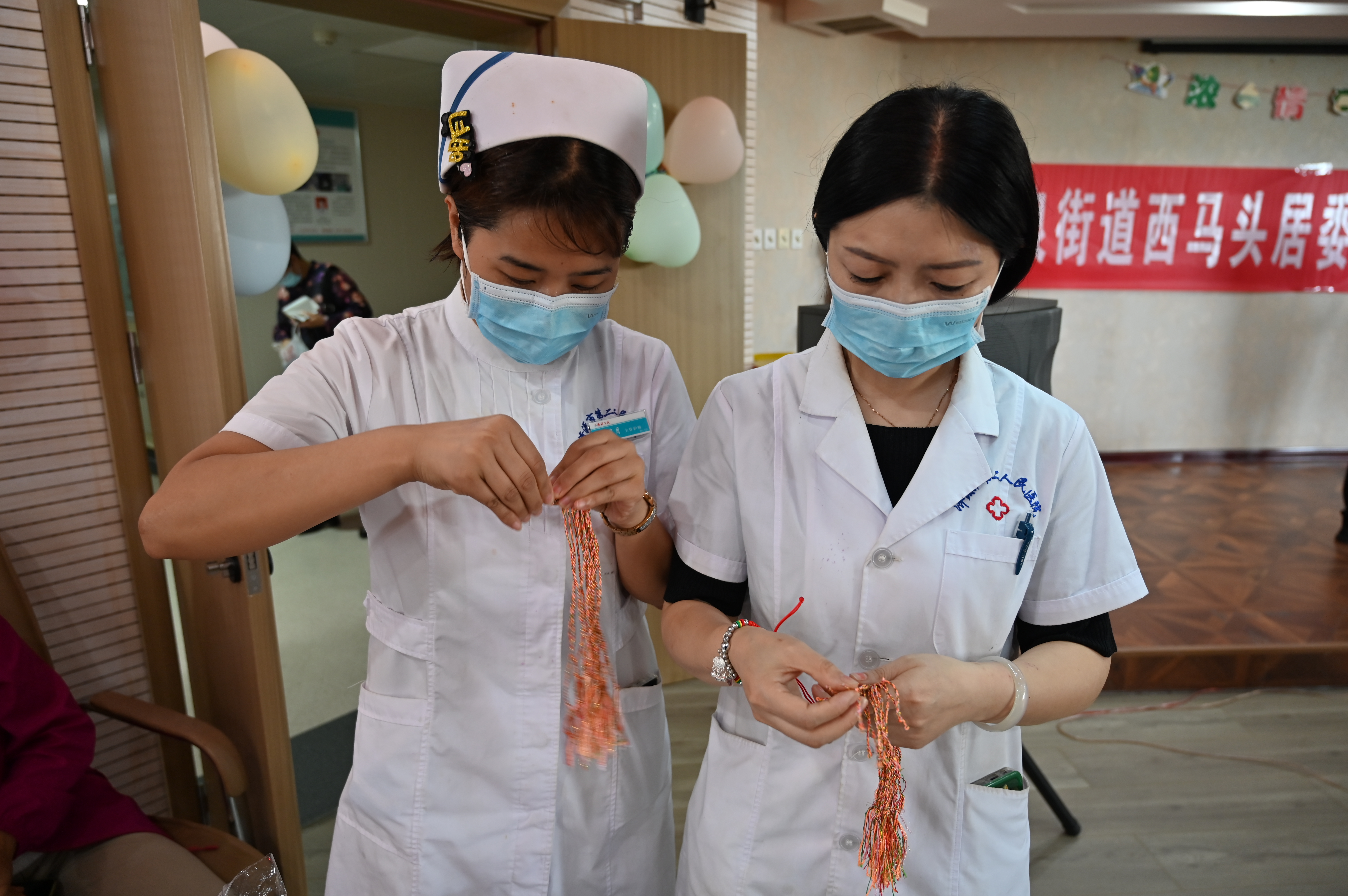 花绳具有美好的祝福和寓意,驱邪避瘟、祝贺祈寿。花绳的五色线代表着五彩斑斓的生命。医护人员俯下身子,将花花绿绿的绳子佩戴到每位老人的手腕上,老人的脸上露出孩童般纯真的笑容。仿佛开启时光机,将老人带回小时候,重温孩童时光。