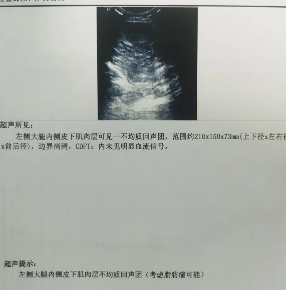 只见旁边站着一位50多岁的男士,面色凝重。我连忙问怎么回事,原来是这位男士跟朋友洗澡时,朋友说他两条腿不一样粗,他并不在意,因为平时还经常打篮球,不会有啥问题,等回家仔细一看,真的差别很大,所以赶紧来医院。通过查体发现患者左侧大腿内侧可以摸到一个巨大梭形肿块,但是比较柔软,边界清晰,稍有压痛,表面光滑。我告诉他,可能是个脂肪瘤,让他不用太担心,做个彩超看看。彩超结果证实了我的判断,大小约20㎝*15㎝,最后患者住院手术切除,病理检查为:脂肪瘤。