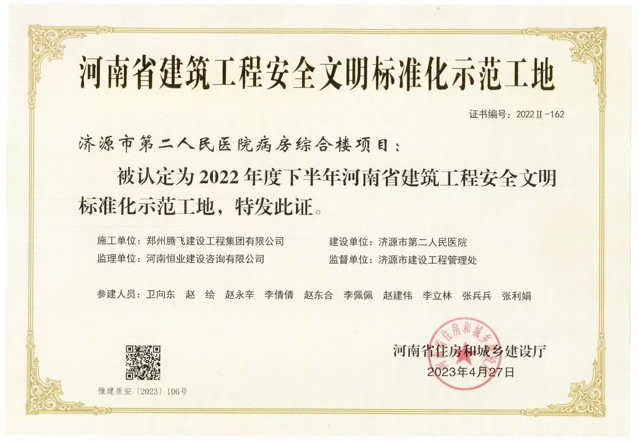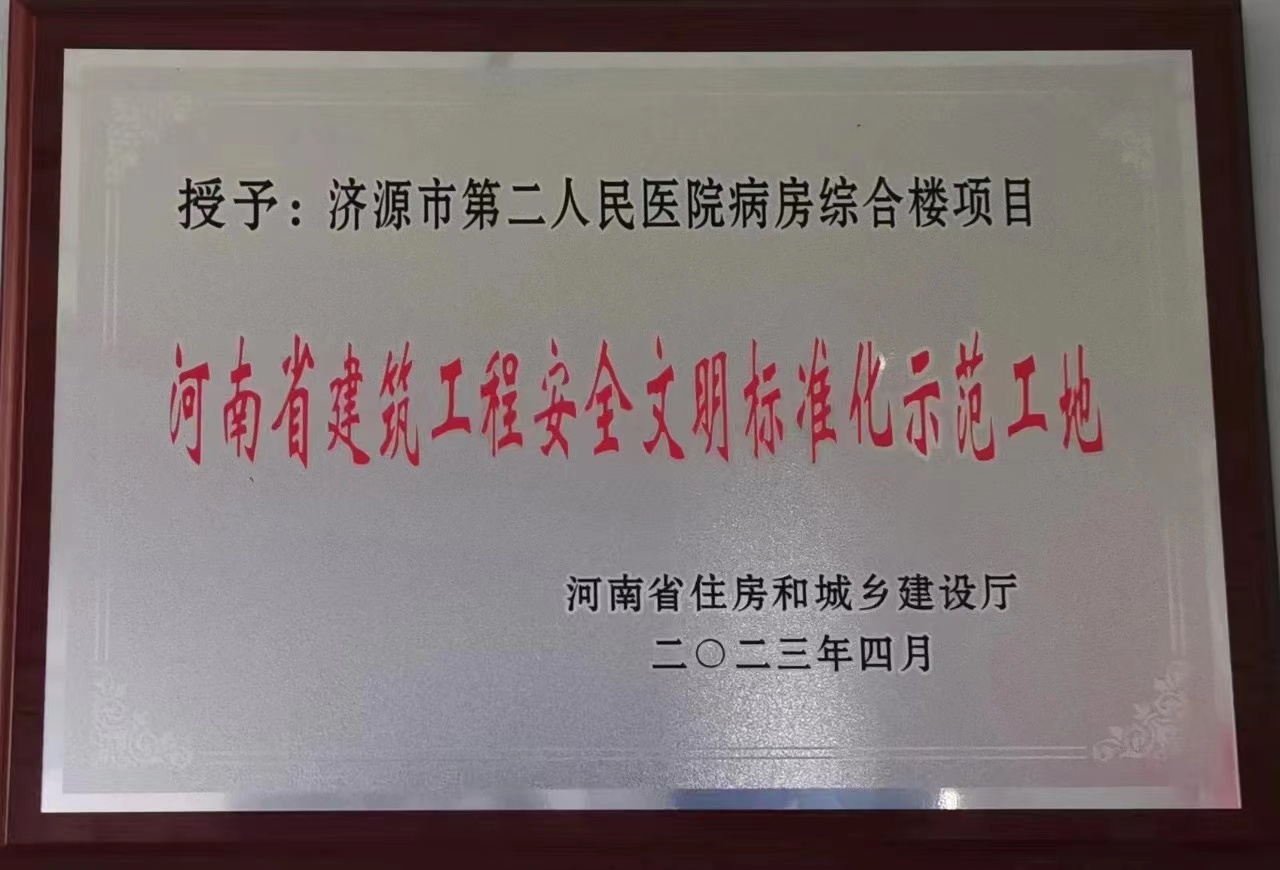 济源市第二人民医院建设项目荣获“河南省建筑工程安全文明标准化示范工地”