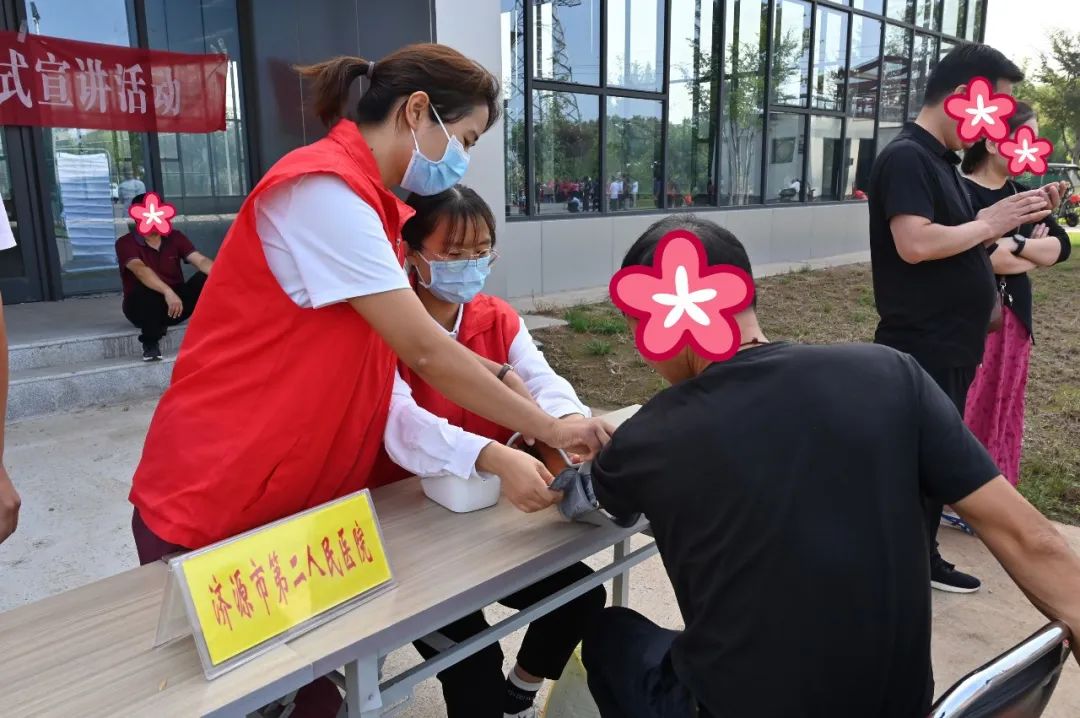 志愿者们看到有村民在排队等待,就拿起《中国健康公民素养66条》,为等候就诊的村民普及健康教育知识,对常见病、多发病的预防及后期治疗注意事项进行讲解。增强群众对疾病预防的意识,引导大家掌握基础健康知识,养成健康的生活方式和良好的卫生习惯。