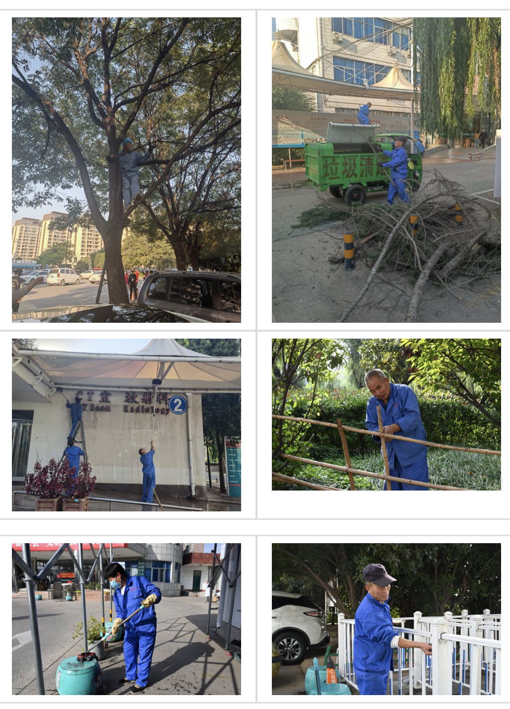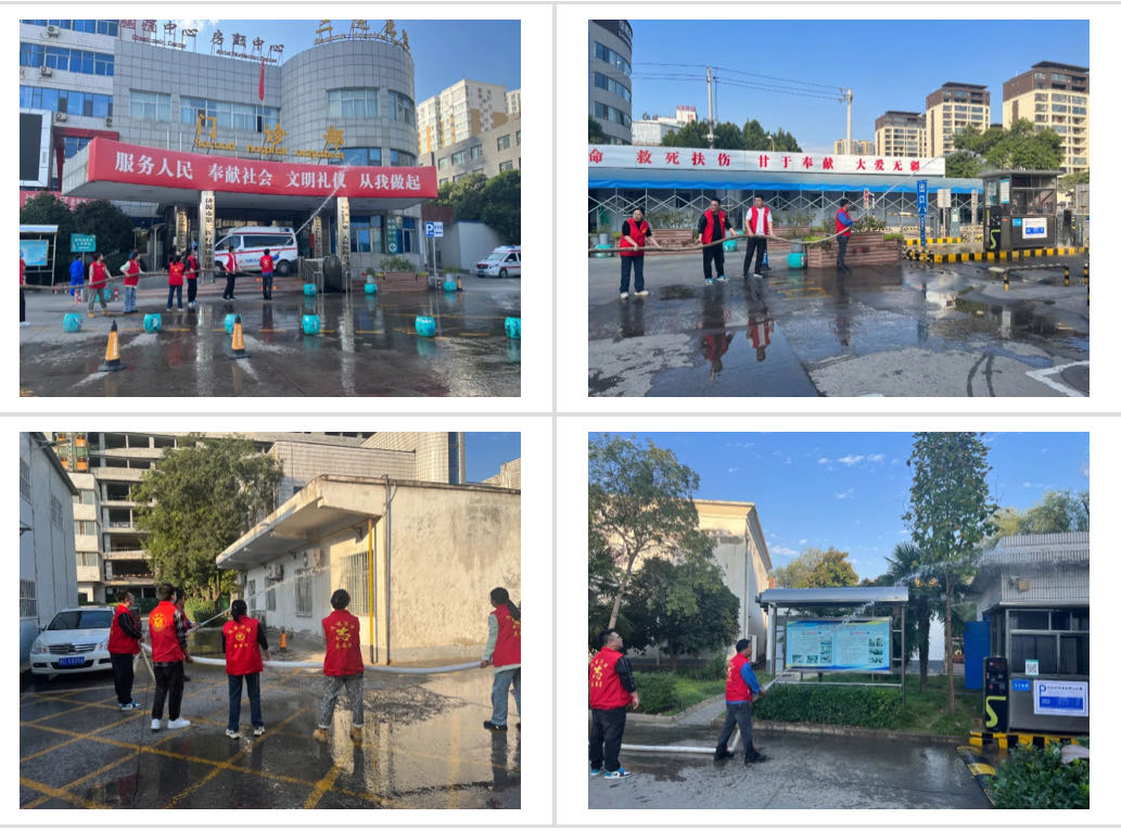 同时,医院志愿者对院区内窗户、创建橱窗、路标、垃圾箱、墙面及空调外机等公共区域进行了冲洗。在不影响院内行人的情况下对地面进行了全面清扫,并用自来水冲洗地面,切实做到了整治一处,清洁一处,靓丽一处。