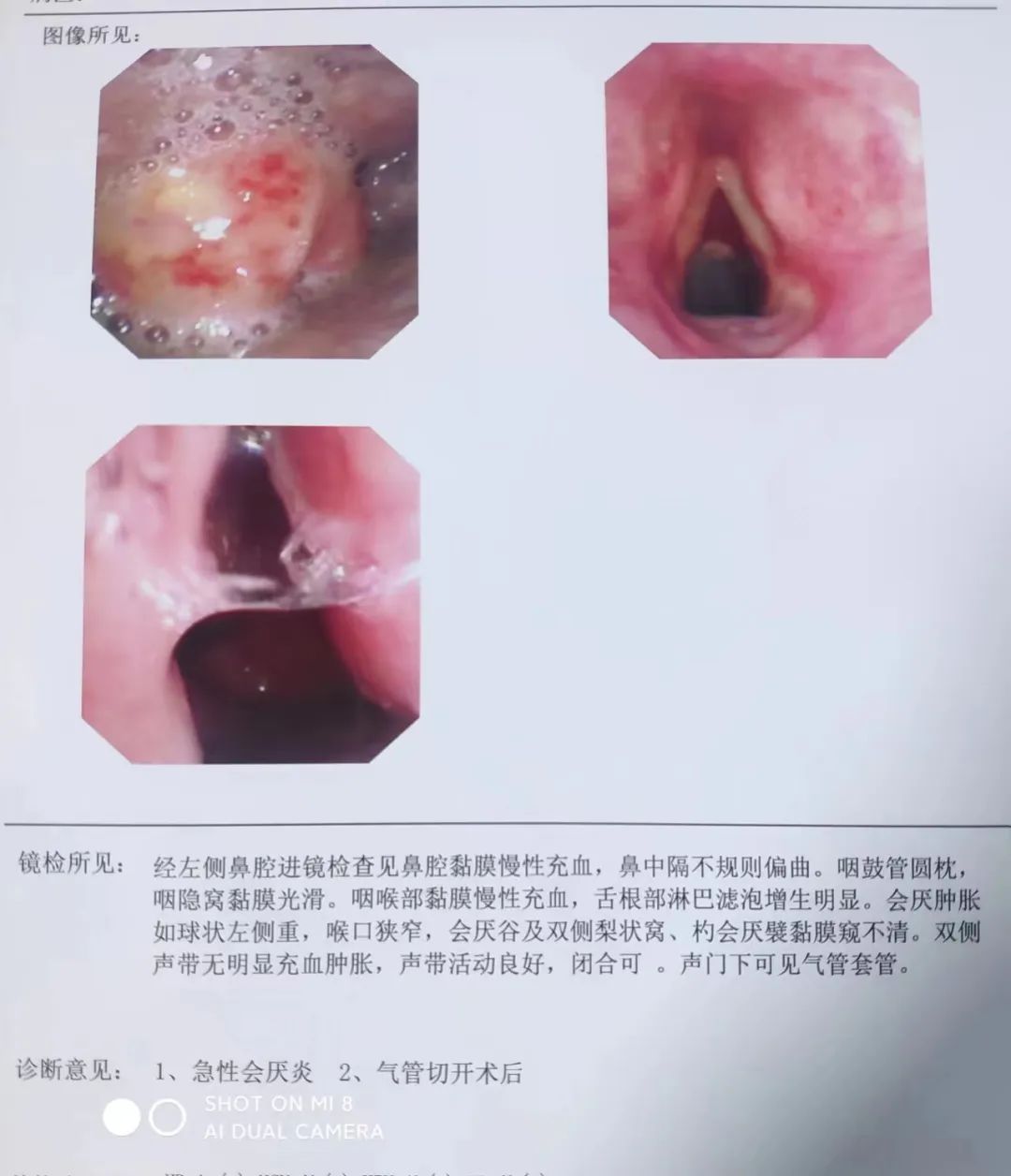 术后3天复查,会厌仍肿胀为球型,气道几乎完全被堵死。