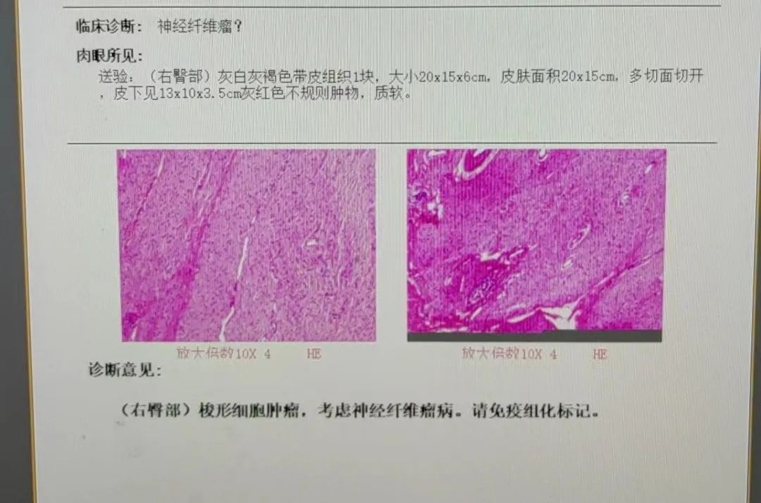 以下附图为患者病理检查结果以及臀部肿物图片: