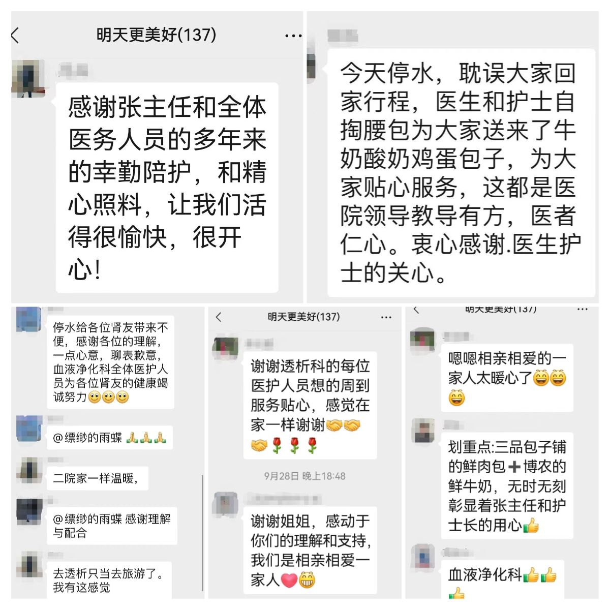 一位透析多年的肾友说:“我有这样的感觉,每次透析就像是来旅游了,二院就像自己家一样温暖。”另一位肾友表示:“今天停水,医生和护士自掏腰包为大家送来了牛奶、鸡蛋、包子,为大家贴心服务,这都是医院领导教导有方,医者仁心,衷心感谢医生护士的关心。”还有肾友表示:“感谢张主任和全体医务人员多年来的辛勤陪护和精心照料,让我们活得很愉快,很开心。”一位退伍爷爷接过晚餐后,多次表示感谢,拉着张佳佳主任的手久久不松开,透析结束离开时还提出与张佳佳主任来张合影。