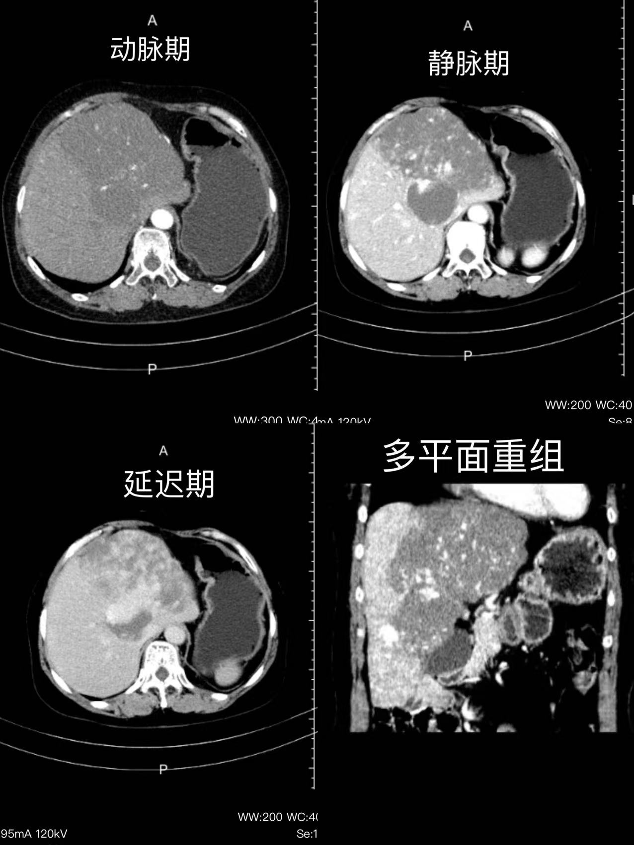 该患者为58岁中年女性,平素体健,饮食无明显异常。行上腹部增强CT检查,影像所见为肝内可见散在多发异常密度影,肝左叶病变较大,形态不规则,边缘欠光整,最大截面约103mm×109mm×121mm,动脉期、静脉期及延迟期造影剂逐步填充。