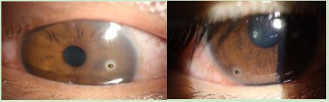 第一眼看到马大哥时,我都震惊了,眼睛肿的睁不开,询问病史说是眼里进东西已经5天了,自己觉得过几天异物会自己出来,现在实在忍不了才来医院。检查发现角膜一个超大异物(我见过最大的异物,直径约2mm,如图),都说眼里容不下沙子,真佩服马大哥的忍耐力,给予表面麻醉,1ml注射器小心剔除异物,术后给予预防感染、促角膜生长因子眼用凝胶点眼,三天后复查愈合良好。