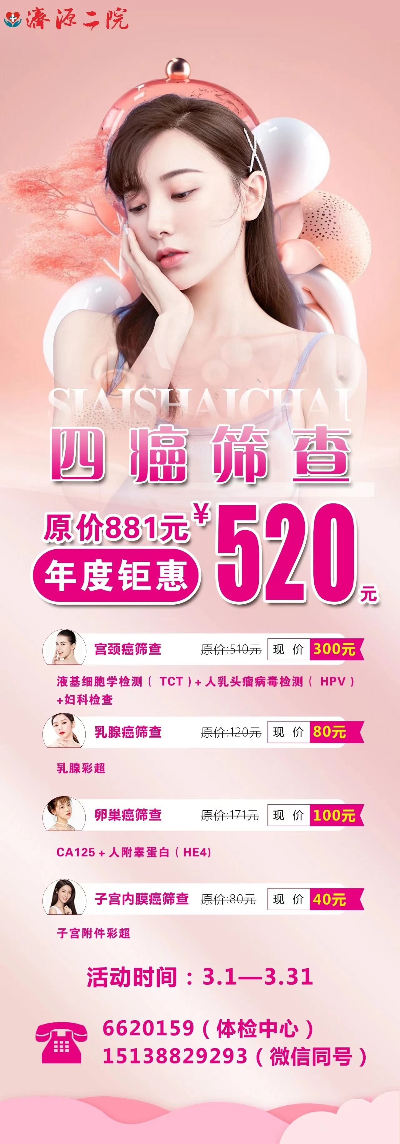为了更多女性的健康,在第114个“国际劳动妇女节”来临之际,济源市第二人民医院体检中心携手妇产科、彩超室、病理科、乳腺外科共同推出:“四癌筛查”体检优惠活动: