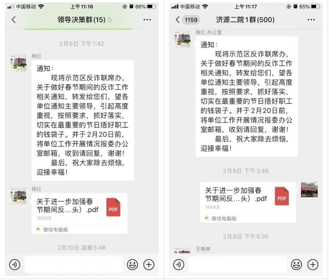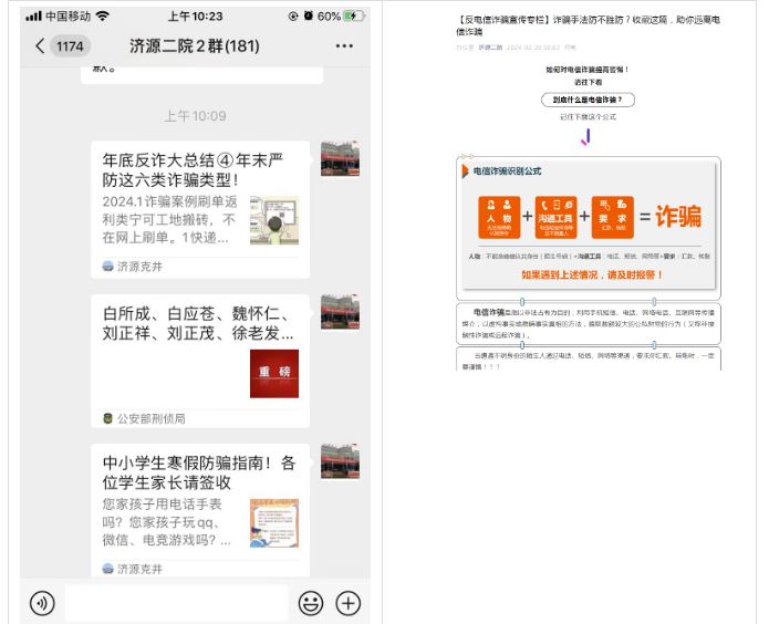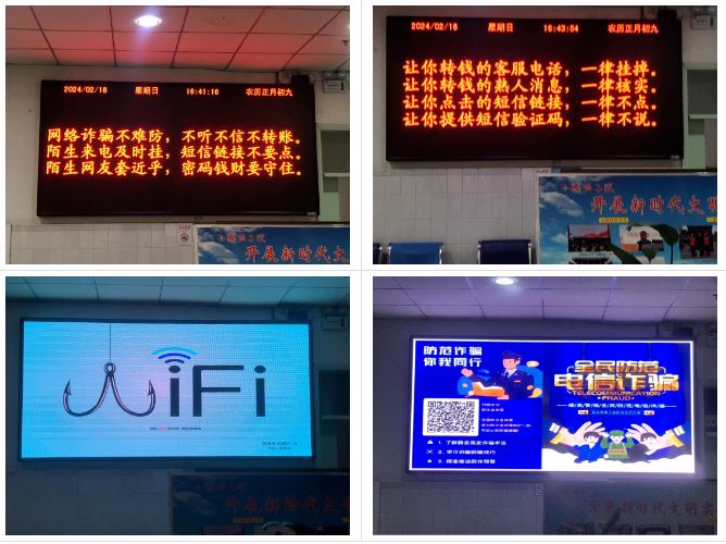 线上线下同步开展,有针对性地在干部职工和群众中间广泛开展反诈骗宣传活动。以多种方式深入宣传反电信网络诈骗,向大众普及电信网络诈骗防范技巧及常识,我院在门诊大厅电子显示屏滚动播放防范电诈宣传警示内容,发放各类防诈骗宣传彩页20余份。持续开展线上宣传,依托微信朋友圈、市二院公众号等网络宣传媒介,不断推送反诈宣传视频和防骗知识,提高群众防骗意识,避免上当受骗。