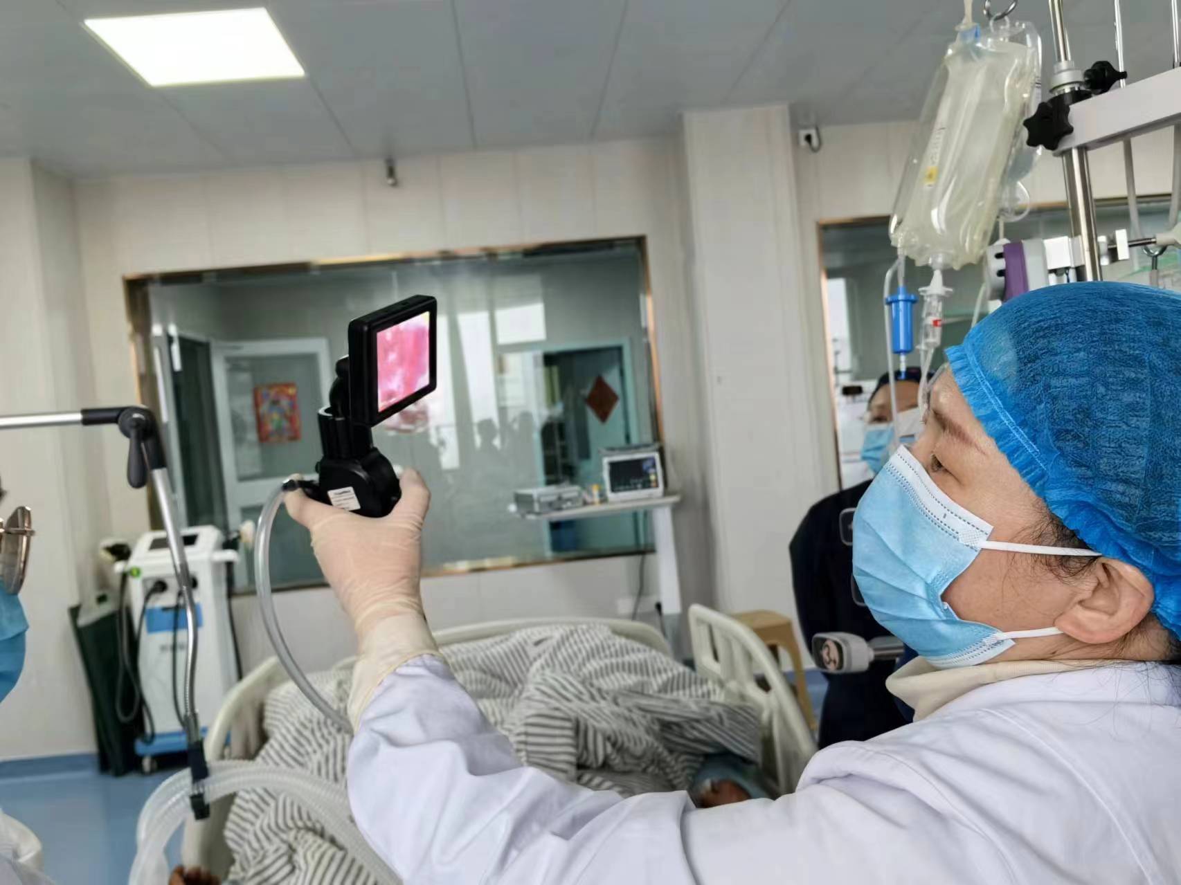 因刘大叔痰液较多且粘稠,为了清除深部痰液及明确肺部情况,王艳梅医生为他行纤维支气管镜检查及灌洗,稀释并抽出痰液。退出纤维支气管镜后,刘大叔氧饱和度达到96%,生命体征相对平稳下来。