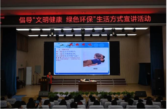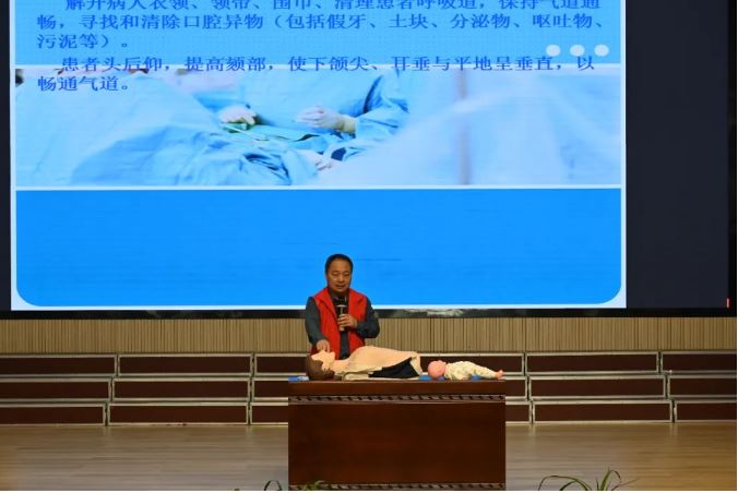 在集中理论授课环节,重症医学科主任蒋万里向大家普及了心肺复苏的重要性,结合课件与教具对应急救护知识、心肺复苏、海姆立克急救法等基本理论知识和操作技能进行了深入浅出、形象生动的讲解,让教师们明白掌握急救知识的必要性。