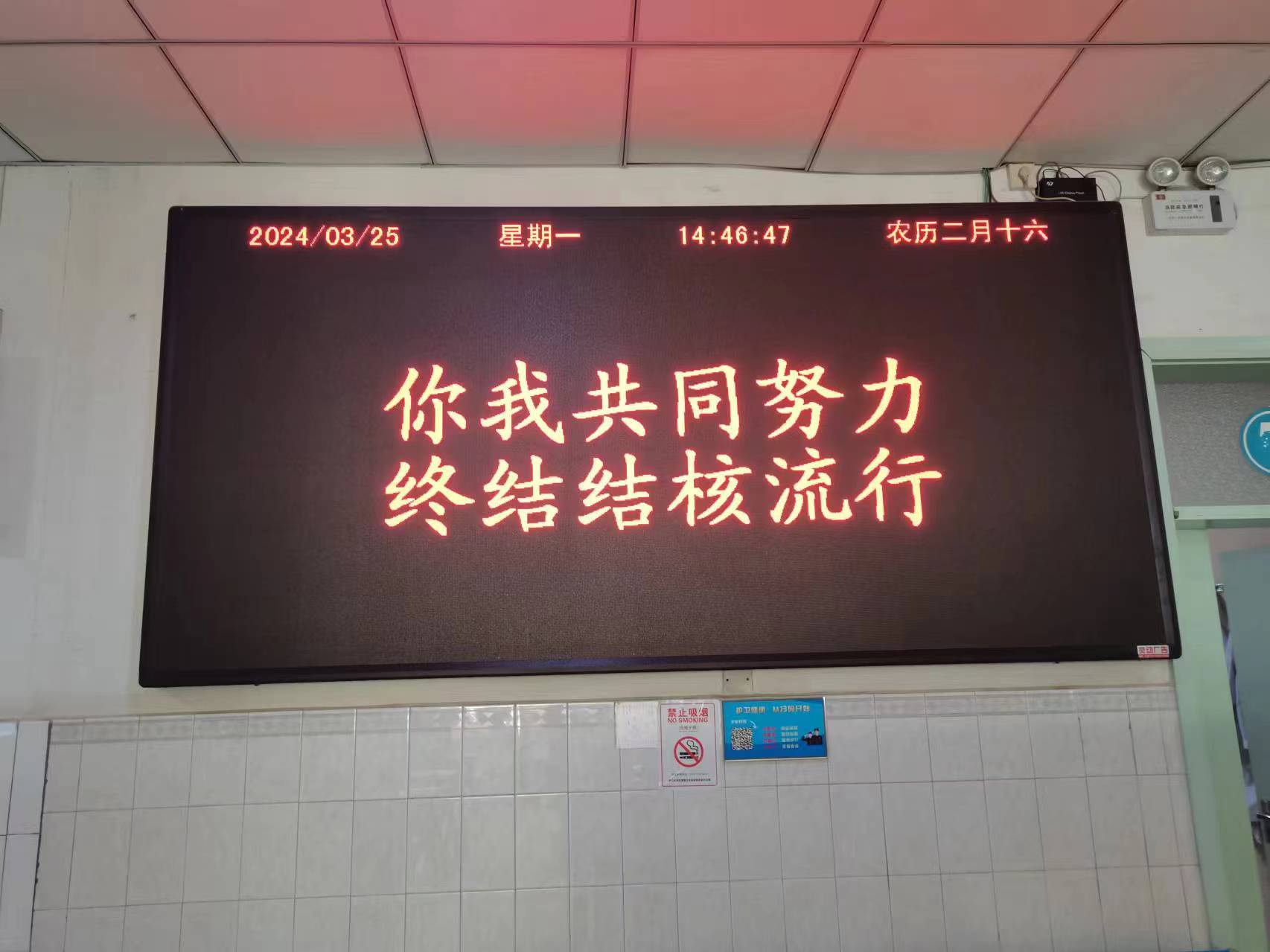 此外,为营造“世界防治结核病日”主题宣传声势,提升人民群众防治结核病意识,大力营造以“你我共同努力,终结结核流行”为主题的浓厚宣传氛围。我院利用门诊大厅LED显示屏,切实加强结核病防治知识宣传工作,扩大结核病的宣传面和覆盖面,让结核病防治知识家喻户晓,深入人心。