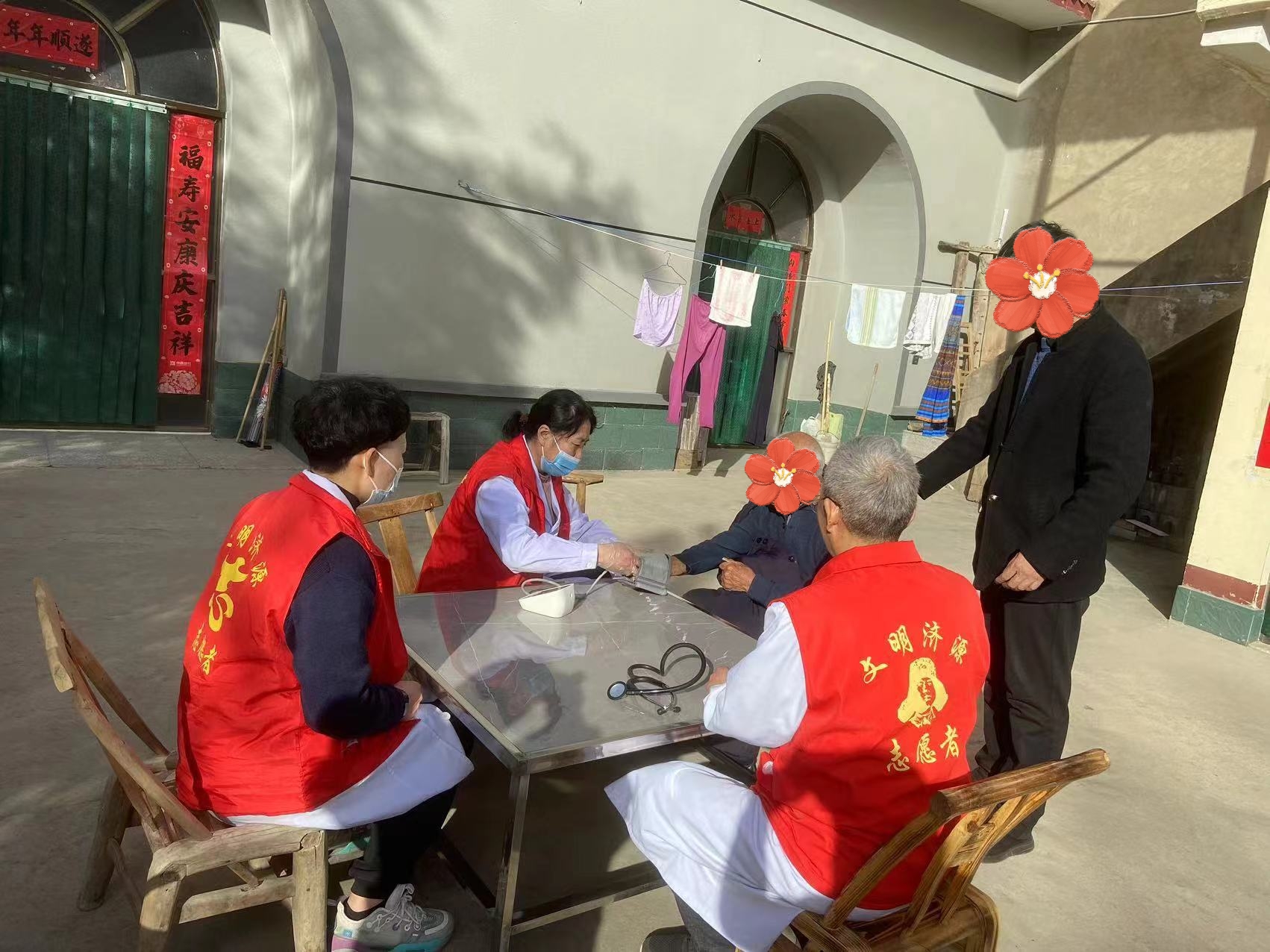 免费为村民测血压,测血糖,村里老年人多,认真为村民听诊,评估健康状况,说明注意事项,从饮食习惯、运动健康、用药指导等方面做好健康宣教,认真记录健康档案。