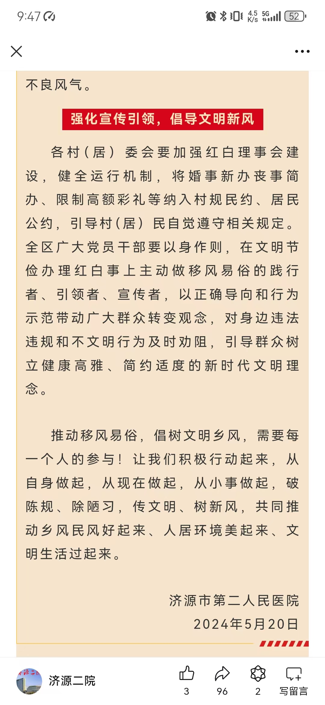 为进一步推进移风易俗工作,根据示范区文明办工作要求,济源市第二人民医院开展一系列移风易俗文明实践活动,树文明新风,做文明济源人。