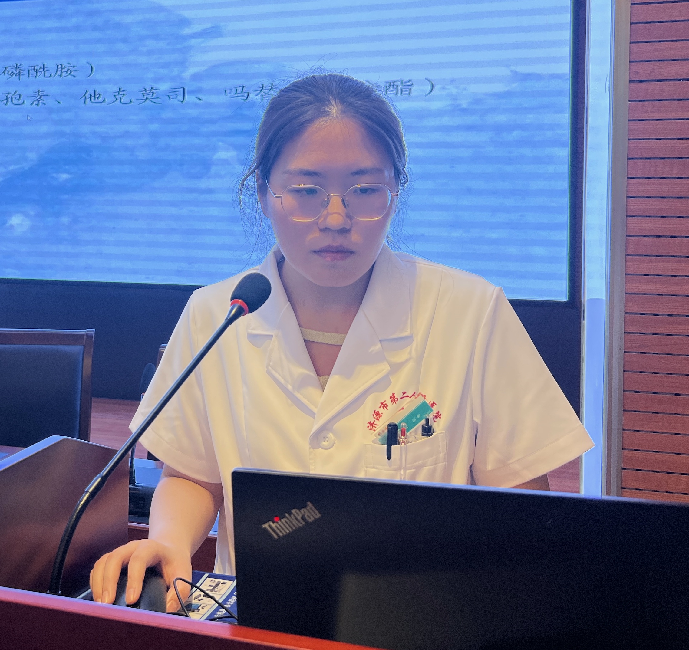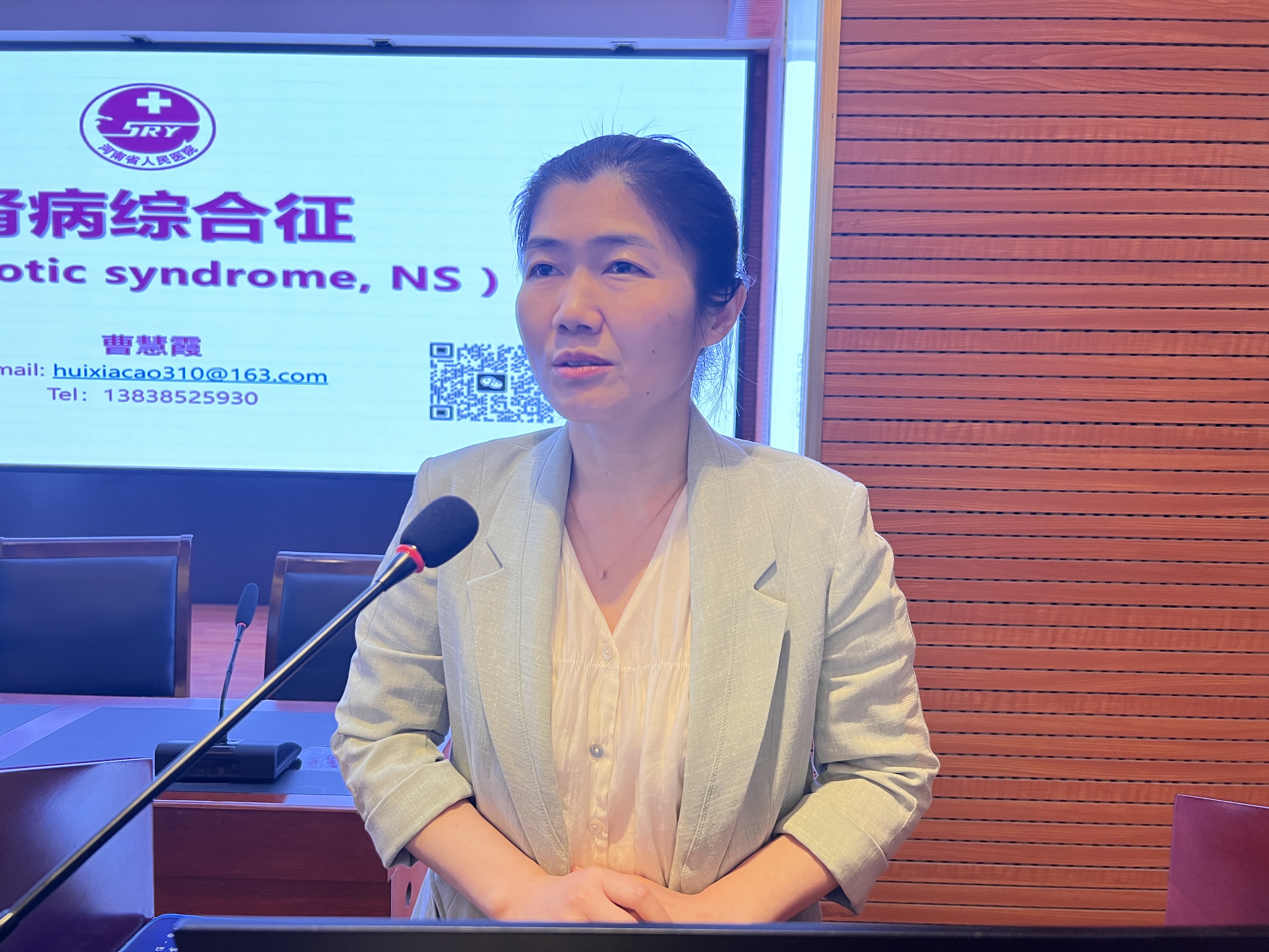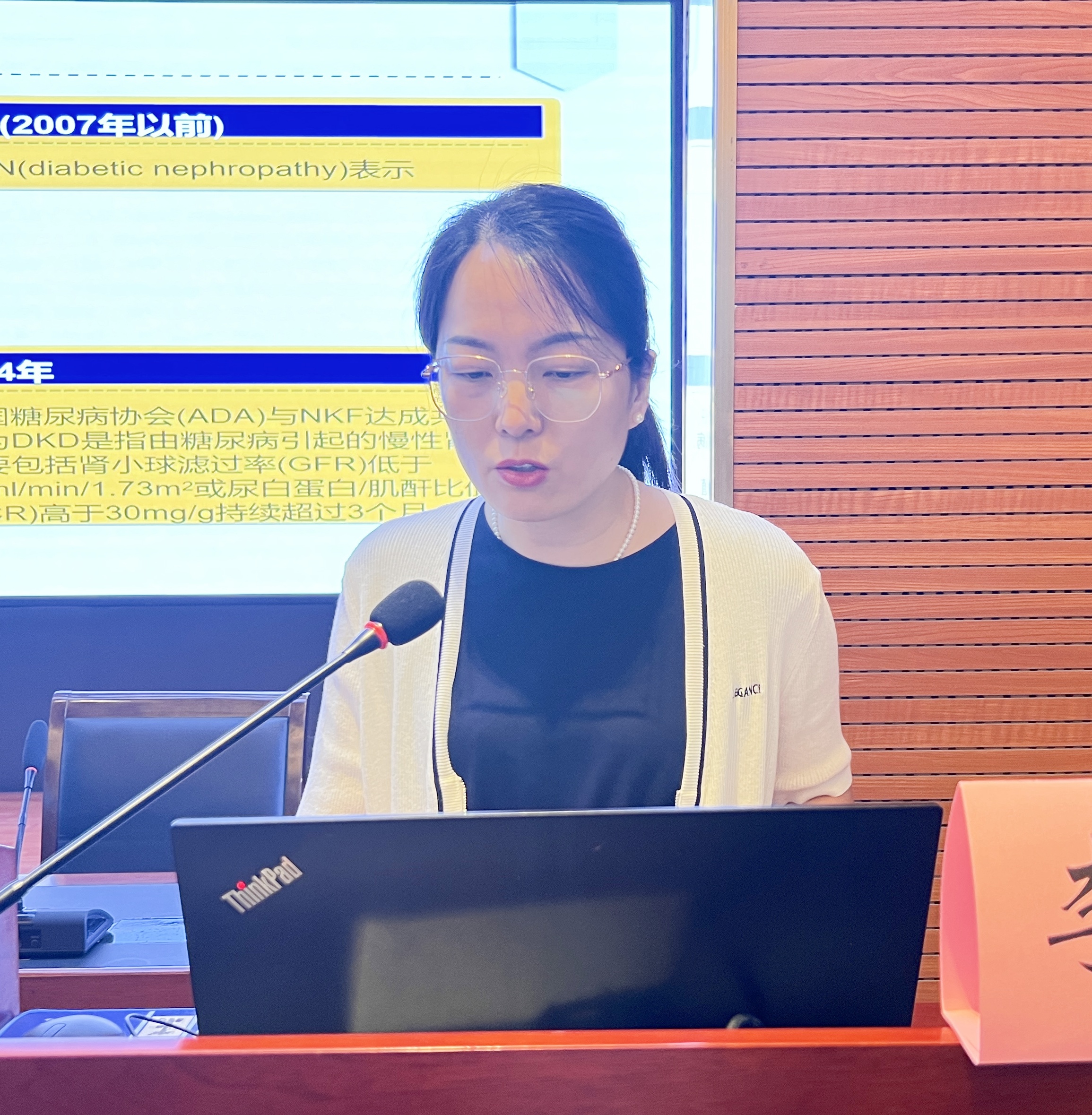肾脏内科主任李路霞对现场专家进行简要介绍。她根据工作实际,以《中国糖尿病肾脏病防治指南》为题,从糖尿病肾脏疾病的定义、DKD的病理、DKD的防治三方面详细讲解慢性高血糖所致的肾脏损害,病变可累及全肾,从而引申出评估、筛查的重要性。随后,她分享了两个经典案例,从主诉、现病史、既往史、辅助检查以及肾脏穿刺活检结果,更让大家明确了DKD的演变过程、原理、诊疗和防治。