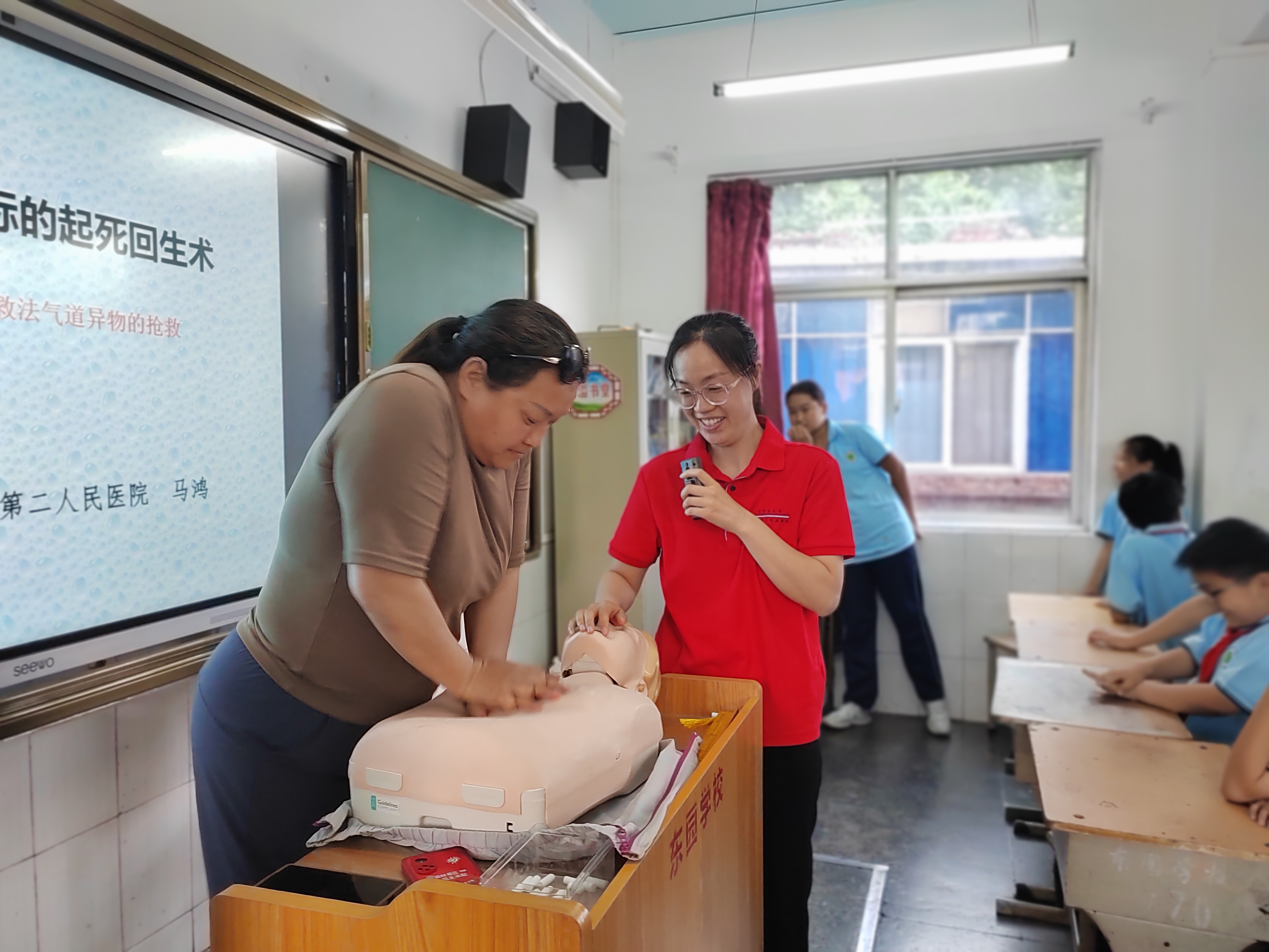 为普及学生自救互救急救知识,不断提高学生的急救知识素养和处理突发事件的能力,5月14日下午,我院糖尿病科马鸿鸿和牛艳香受邀走进济源市东园小学为学生带来一节不一样的课程。