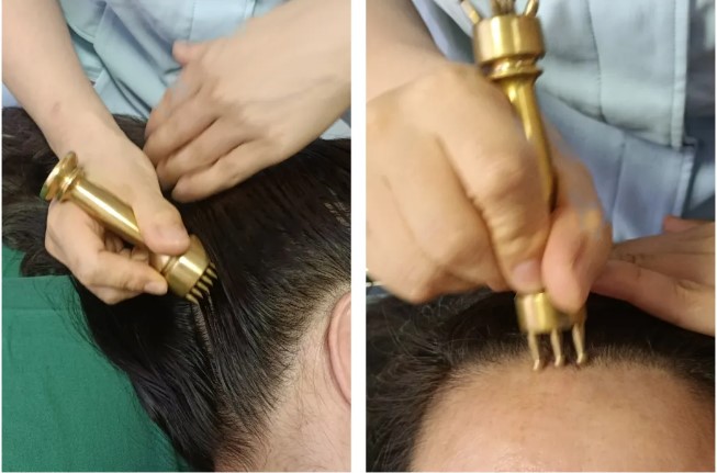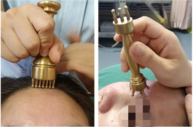 杵针疗法是运用一定的手法,刺激人体体表经络、腧穴,从而作用于脏腑以调和阴阳、扶正祛邪、疏通经络、行气活血。能促进脑部血液循环。杵针集针、砭、按摩之长,不刺入皮肤肌肉,无破皮伤肌之苦,无交叉感染之虑。