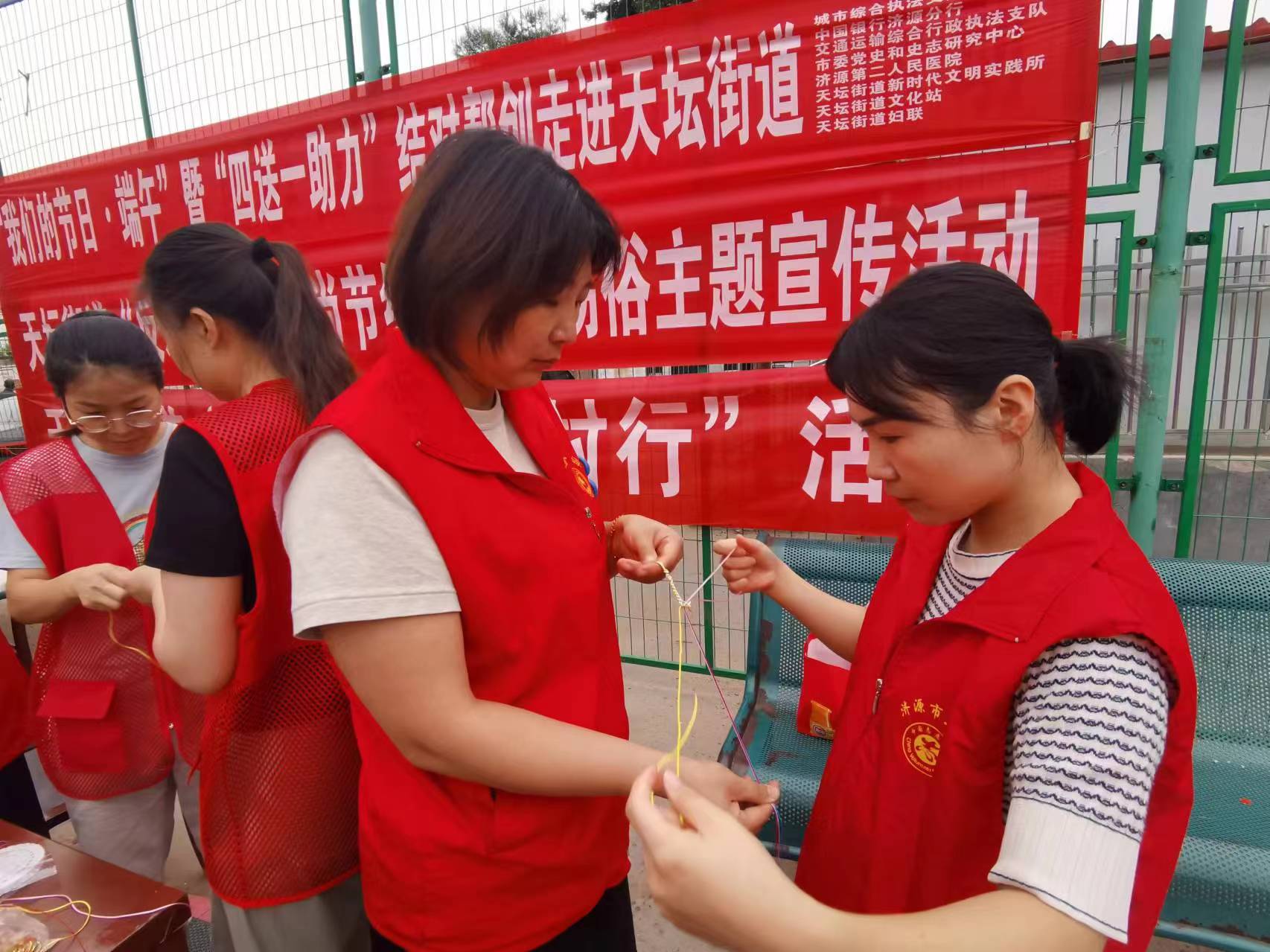 端午节的传统习俗有包粽子、挂艾草、系五彩绳等。志愿者们准备好物品,开始为群众包粽子、编彩绳。活动现场大家干得热火朝天,参与的群众表示很有节日的氛围,很开心。